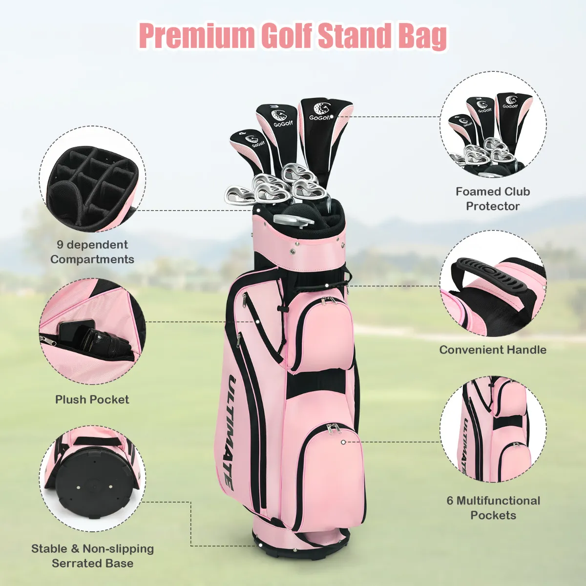 Speciaal ontworpen voor gemiddelde tot gevorderde spelers, deze dames complete golf clubset brengt je golf naar een nieuw niveau. Deze golfclub set omvat een gelegeerde bestuurder, 3# fairway wood, 4# hybride, 6#-9# ijzers, pitching wedge, putter en de lichtgewicht stand tas. Ondertussen kun je ook de pitching wedge gebruiken om de bal over obstakels te slaan. Omdat je de set ook mee naar buiten neemt, wordt hij geleverd met een stand golftas voor handig gebruik. Verstelbare riemen helpen u om de tas gemakkelijk overal mee naar toe te nemen.