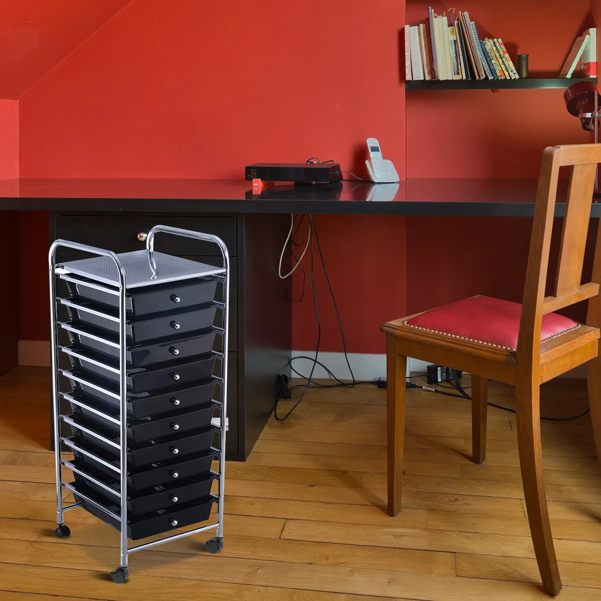 Deze opbergwagen heeft 10 grote lades, perfect voor het opbergen en ordenen van papier, kantooraccessoires, knutselspullen en meer. Het heeft ook lange, gemakkelijk vast te pakken handvatten en een geperforeerde metalen bovenplank. Het frame is stevig en gebouwd van verchroomd staal, wat roestvrij, duurzaam en stabiel is. Elke rollende organisator heeft vier zwenkwielen voor gemakkelijke mobiliteit, waarvan er 2 in een vaste positie worden vergrendeld om onnodige ongelukken te voorkomen. Het zwarte uiterlijk voegt niet alleen een klassieke stijl toe aan uw kamer, maar houdt ook uw persoonlijke spullen privé. Dankzij de kleine afmetingen past de organisator bijna overal in uw huis of kantoorruimte. Stop hem in elke kamer en vereenvoudig uw dagelijkse leven met gemakkelijke opslag. Deze kunststof opbergkast is geschikt voor gebruik in een slaapkamer, keuken, speelkamer, klaslokaal, kantoor of zelfs garage.