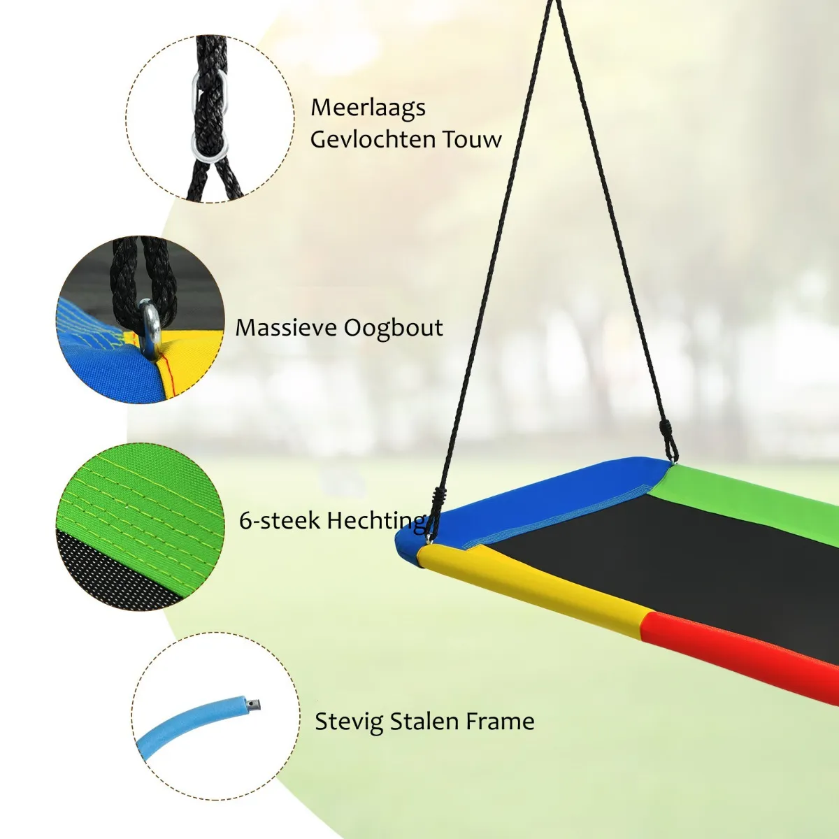 Veilige en duurzame schommel: De boomschommel is gemaakt van sterk en gegalvaniseerd staal, PP-mat en hoogwaardig oxford-doek, waardoor hij jarenlang kan worden gebruikt. Door de uitstekende afwerking heeft hij een draagvermogen van ongeveer 150 kg en kan hij veilig worden gebruikt.