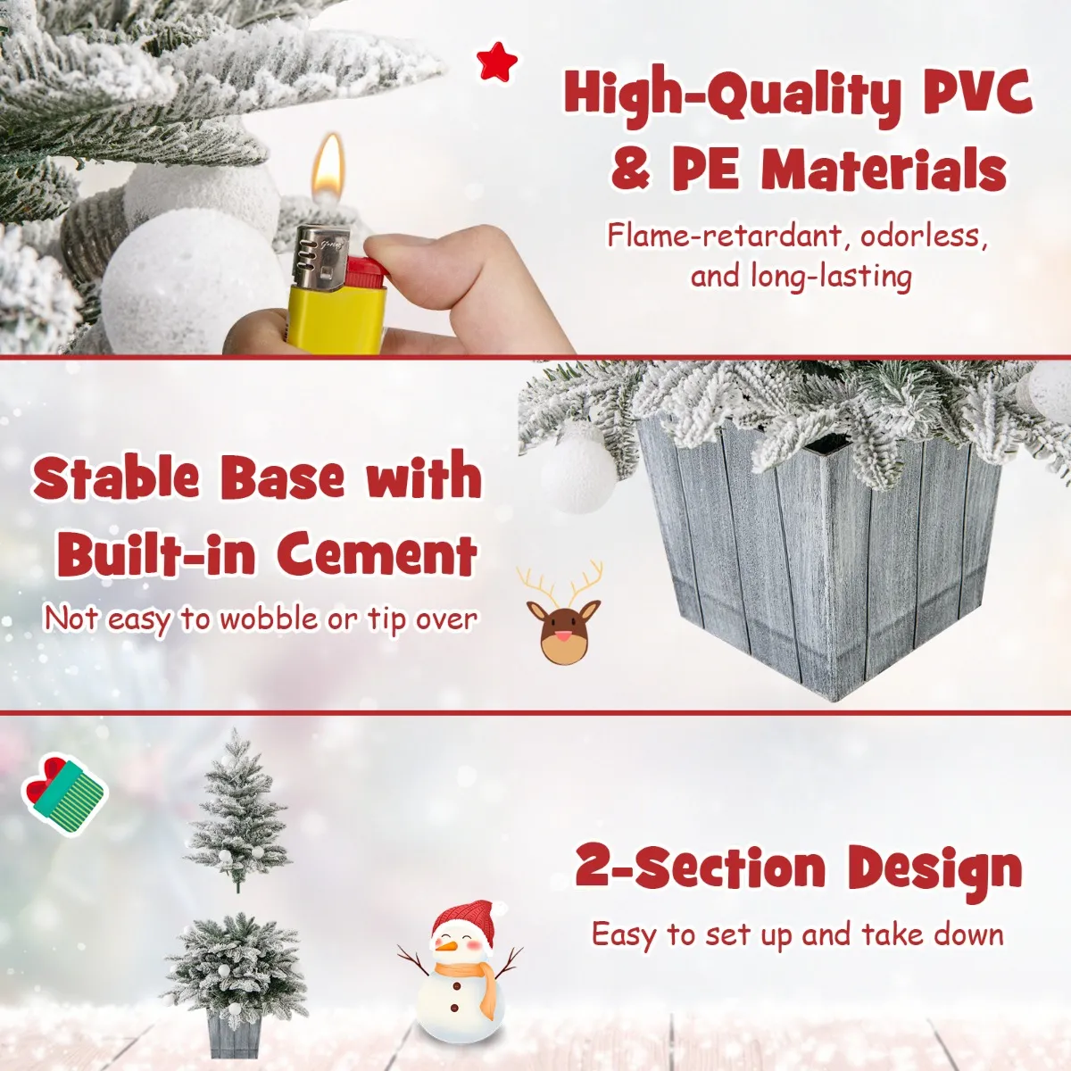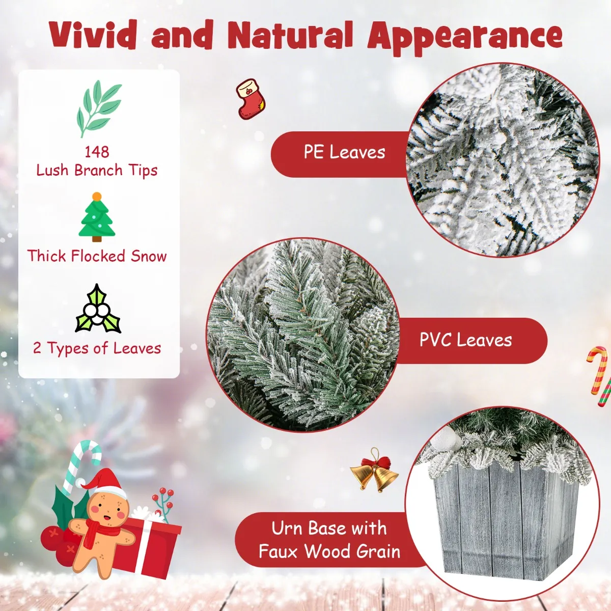 【Levendige, natuurlijke look】: De kerstboom van 100 cm is versierd met 148 weelderige takuiteinden, met 2 soorten bladeren: PVC- en PE-bladeren. Bovendien zijn de bladeren bedekt met dikke, gevlokte sneeuw, die een vleugje wintermagie aan je huis toevoegt.