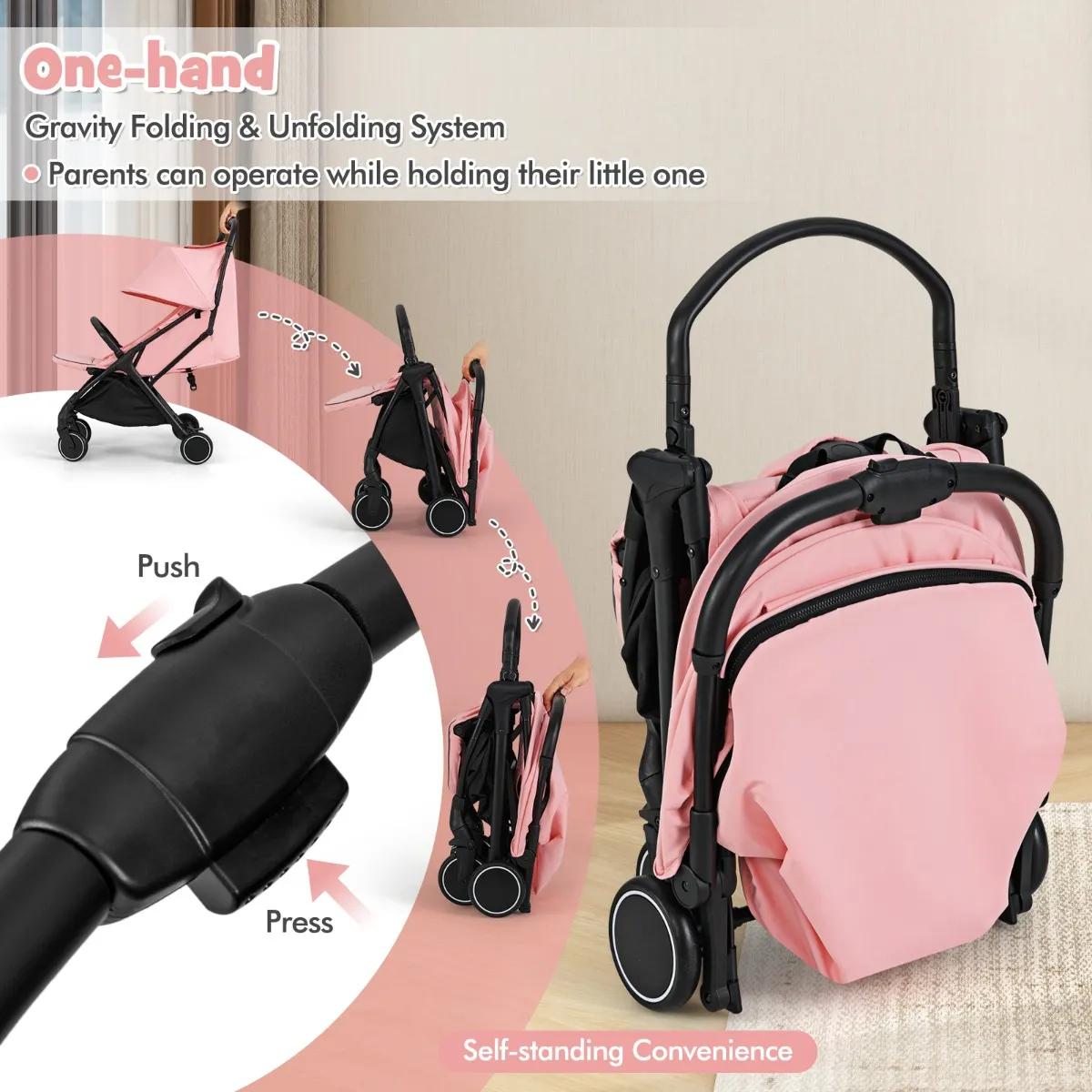 【In- en uitvouwen met één hand】: Deze kinderwagen heeft een innovatief zwaartekracht in- en uitvouwsysteem met één hand, zodat ouders hem kunnen gebruiken terwijl ze hun kleintje vasthouden. Bovendien staat hij rechtop wanneer hij opgevouwen is, zodat je hem niet tegen een muur hoeft te leunen.