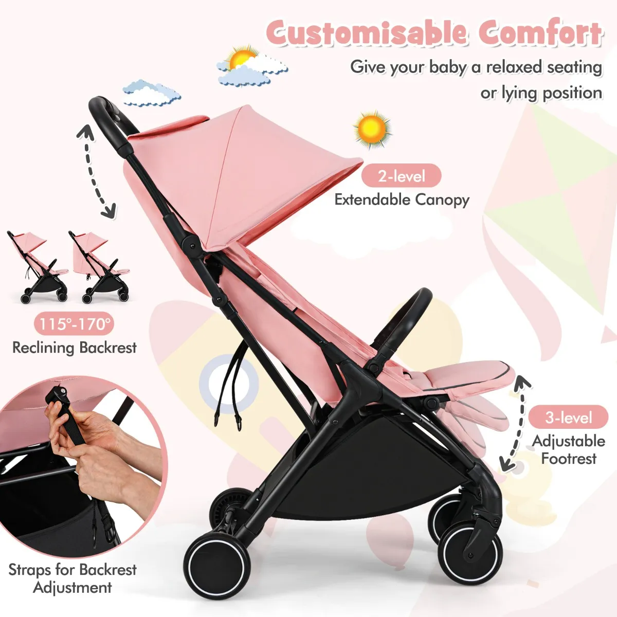 【Veelzijdig comfort】: Deze compacte kinderwagen heeft een verstelbare rugleuning die verstelbaar is van 115° tot 170°, zodat je baby ontspannen kan zitten of liggen. Met een in 3 standen verstelbare voetsteun biedt hij comfort op maat in elke groeifase van je baby.