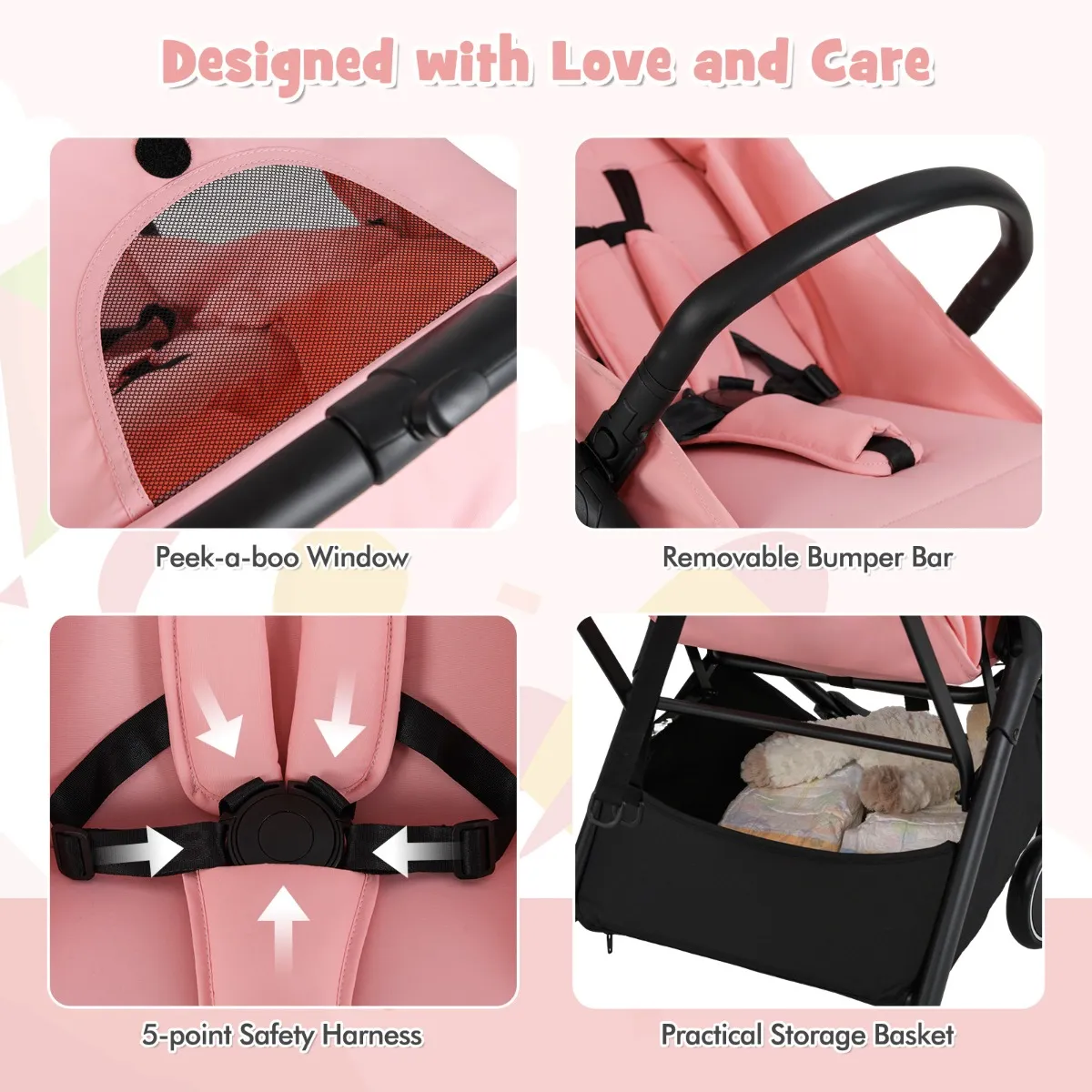 【Veiligheid voor alles】: Uitgerust met een 5-puntsgordel en een eenvoudig te gebruiken eenstapsrem, kun je gerust zijn in de wetenschap dat je kind veilig is. Of je nu stilstaat of onderweg bent, deze kinderwagen garandeert de veiligheid van je kind.