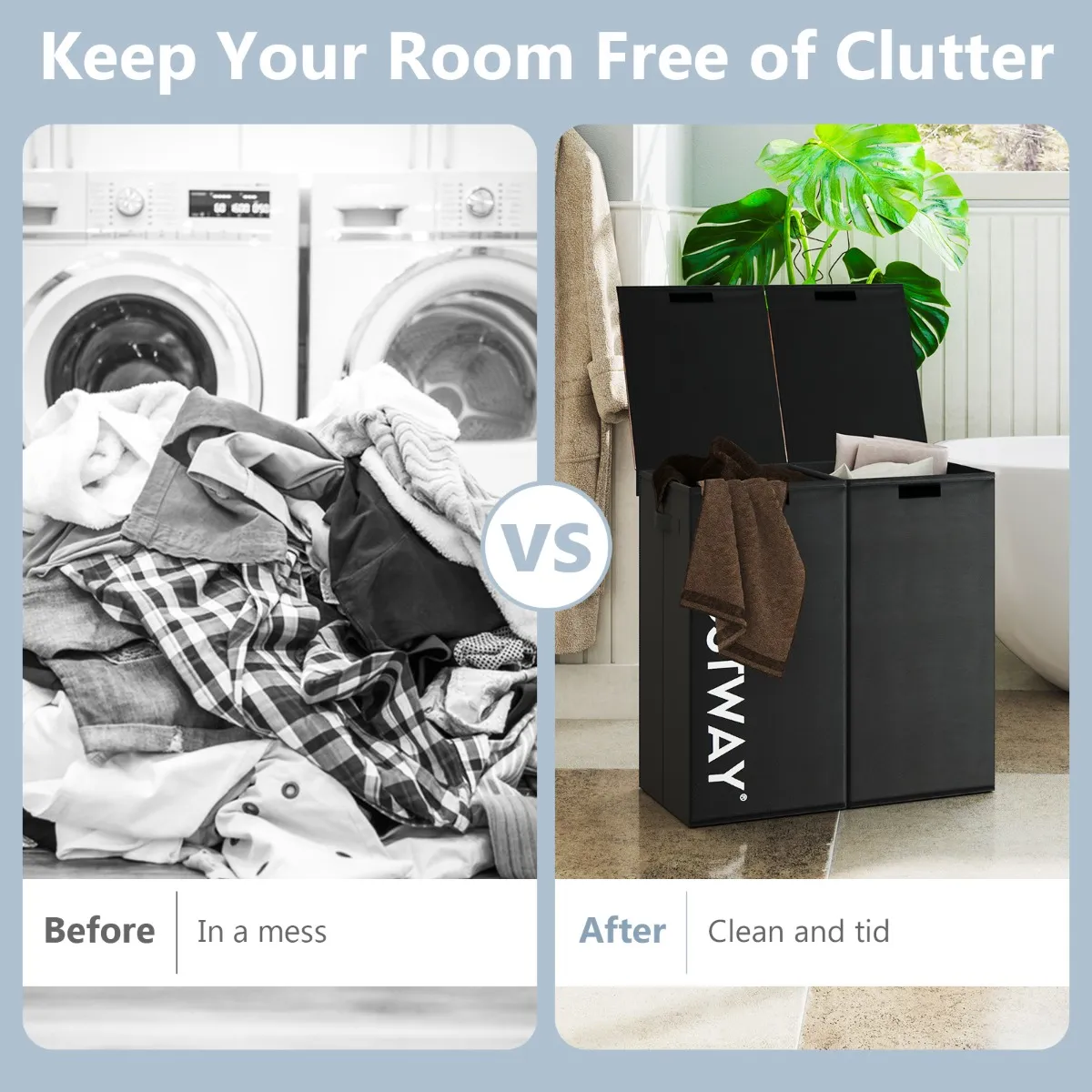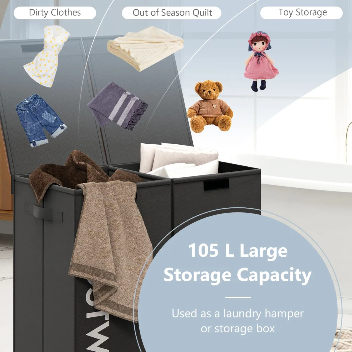 【Ontwerp met twee vakken】: Met een grote capaciteit van 105 liter is deze wasmand met 2 vakken ideaal om je wasgoed op stoftype of kleur te sorteren en zo voor meer orde bij huishoudelijke werkzaamheden te zorgen.