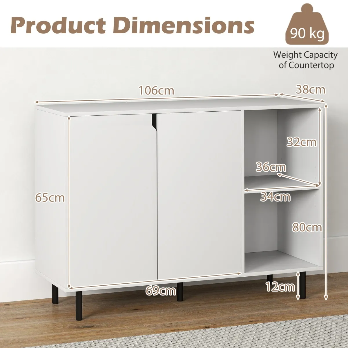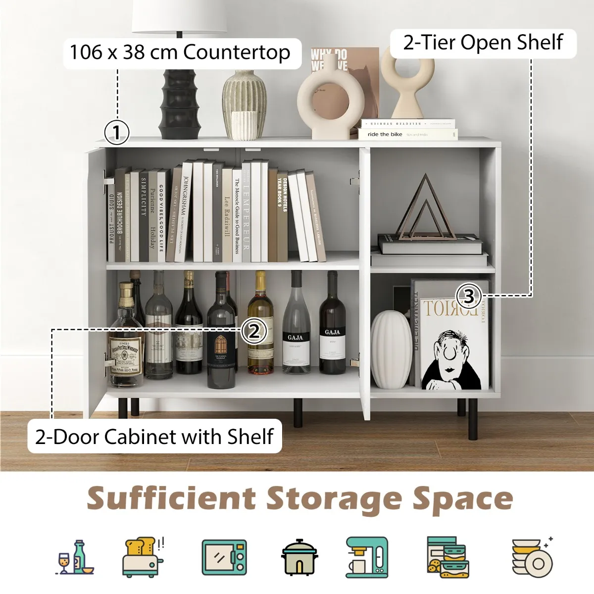 Dit stijlvolle dressoir van 106 cm heeft een ruim werkblad, een 2-deurskast met een binnenplank en een open plank van 2 niveaus die voldoende ruimte bieden voor het opbergen van serviesgoed en keukenbenodigdheden. De planken zijn verstelbaar, zodat je ze kunt aanpassen voor verschillende items. Hij wordt ondersteund door 5 metalen poten voor stabiliteit en de anti-kantelset is ontworpen voor extra veiligheid. Of het nu in de keuken, hal, eetkamer of als koffiebar wordt geplaatst, dit dressoir verbetert de functionaliteit van de ruimte.