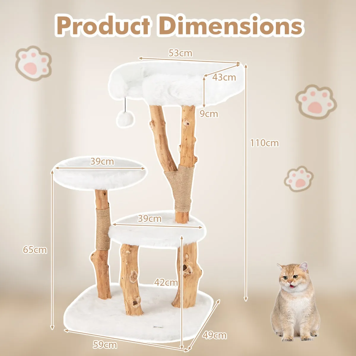 Deze prachtig vervaardigde krabpaal bestaat uit natuurlijke perenhouten stammen met unieke nerven, die niet alleen de esthetiek verbeteren, maar ook een stabiele en veilige structuur garanderen waarop je kat kan uitrusten en spelen. Er is een gezellig oppervlak om de omgeving te observeren, 2 ronde platforms om te ontspannen en te springen, jute palen voor het slijpen van nagels en een bungelende pluche bal voor interactief plezier, die meerdere niveaus van plezier biedt. Bovendien is elk platform bedekt met 800 g/m² hoogwaardige lange pluche stof, die ongeëvenaarde zachtheid en comfort biedt voor het welzijn van je kat. Geef je geliefde huisdier met deze krabpaal van massief hout een natuurlijk en leuk toevluchtsoord.