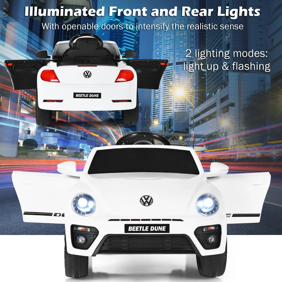 【Gelicentieerde kever】 Deze kever is officieel door Volkswagen gelicentieerd en krijgt door de dubbele deuren een realistisch uiterlijk. De deuren kunnen worden geopend en vergrendeld, terwijl de koplampen aan blijven of samen met de dashboardverlichting knipperen, waardoor de auto authentiek en aantrekkelijk lijkt.