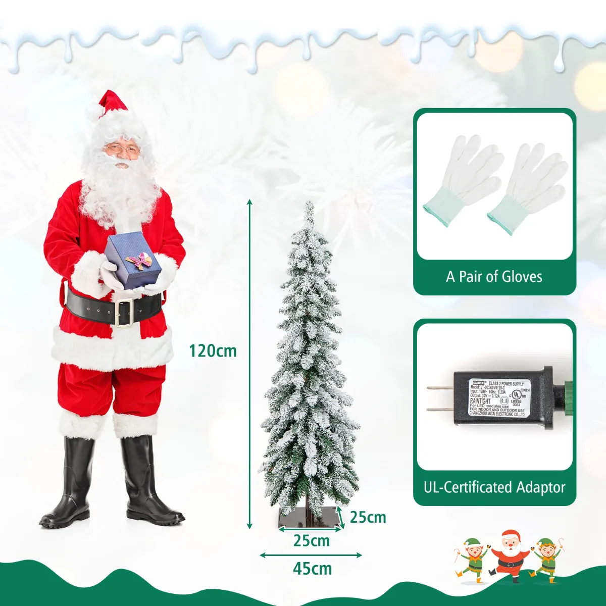 Hij is versierd met 225 taktoppen, liefdevol bedekt met sneeuw, om een ​​adembenemende wintersfeer te creëren. Deze charmante decoratieve boom is gemaakt van 100% nieuw PVC en is niet alleen prachtig, maar ook ideaal bestand tegen brand, verkleuring en allergieën. Tot 100 LED-lampjes verlichten de kerstboom met 2 magische lichtkleuren, warm wit en kleurrijk, waardoor de perfecte sfeer ontstaat. Het verfijnde ontwerp verrukt gasten met 11 dynamische modi. Het heeft ook een automatische timer die 6 uur aan en 18 uur uit blijft om energie te besparen. Op zijn stevige, vierkante metalen standaard staat deze kerstboom hoog, onwankelbaar en onbuigzaam, met reserveschroeven die voor extra stabiliteit zorgen als hij wiebelt. Deze veelzijdige schoonheid is een prachtige aanvulling op elk kantoor, huis, school of winkel en laat een onuitwisbare indruk achter in elke ruimte. Zodra de festiviteiten voorbij zijn, kan het gemakkelijk in 2 delen worden opgesplitst voor opslag. En een paar handschoenen beschermen uw handen.