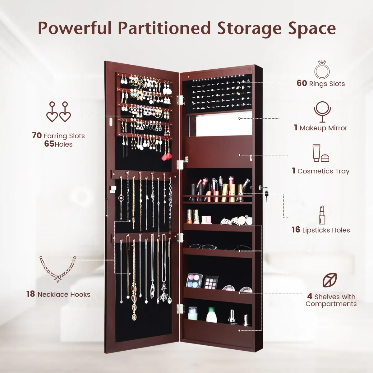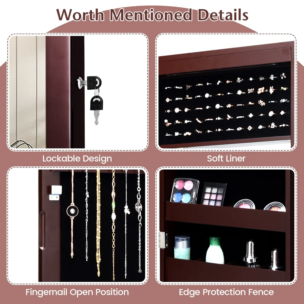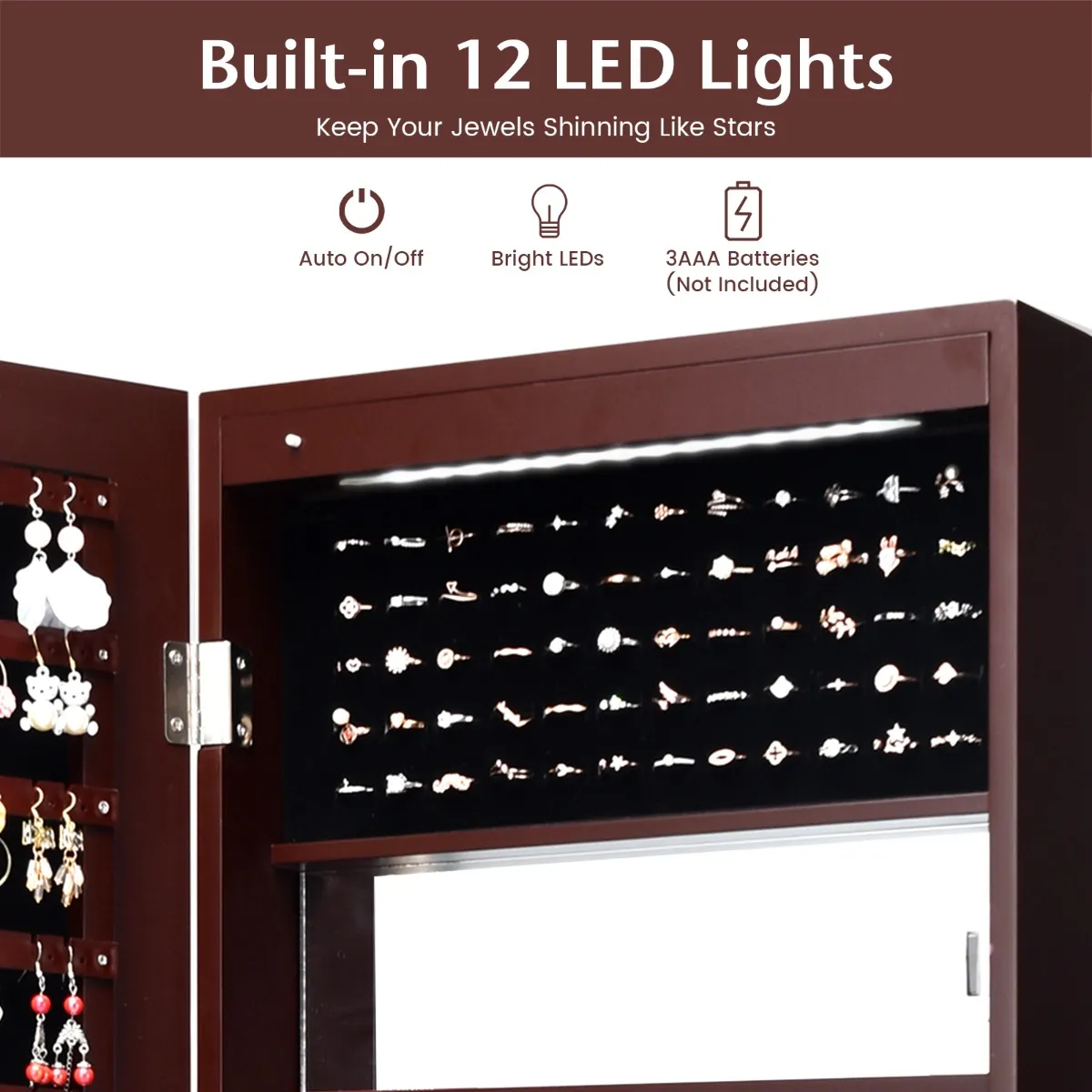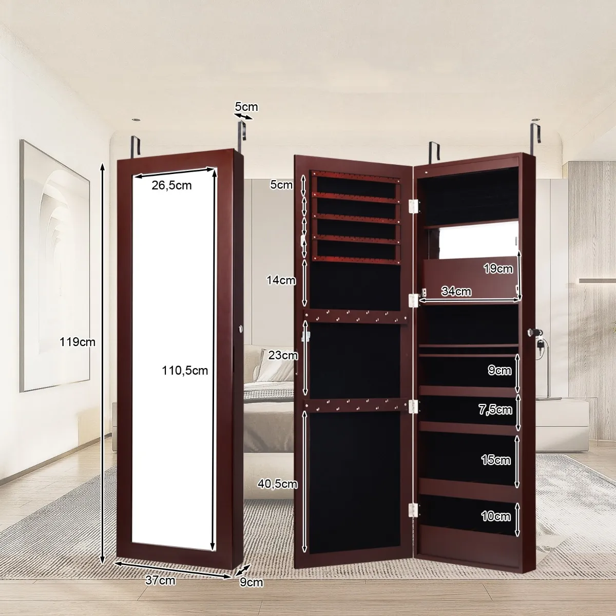 Onze led-sieradenkast met spiegel kan multifunctioneel met spiegel, deur en ledlicht worden gecombineerd en wordt zo een opvallend kunstwerk dat speciaal voor al je waardevolle spullen is ontworpen. De sieradenkast helpt je om je sieraden georganiseerd te bewaren en voorkomt dat ze in de war raken. Het afsluitbare ontwerp beschermt je sieraden tegen ondeugende kinderen. De ingebouwde 12 ledlampen zorgen voor een vleugje luxe en verfraaien je sieraden in de kast. De zwarte fluwelen voering beschermt de sieraden effectief tegen krassen en kan ook gemakkelijk met een zachte, droge doek worden onderhouden. De sieradenkast is praktisch voor het uitproberen van je kleding of sieraden, als je een uitstapje voorbereidt of aan een formeel evenement deelneemt. Bovendien past het chique en elegante design bij de inrichting van je slaapkamer.