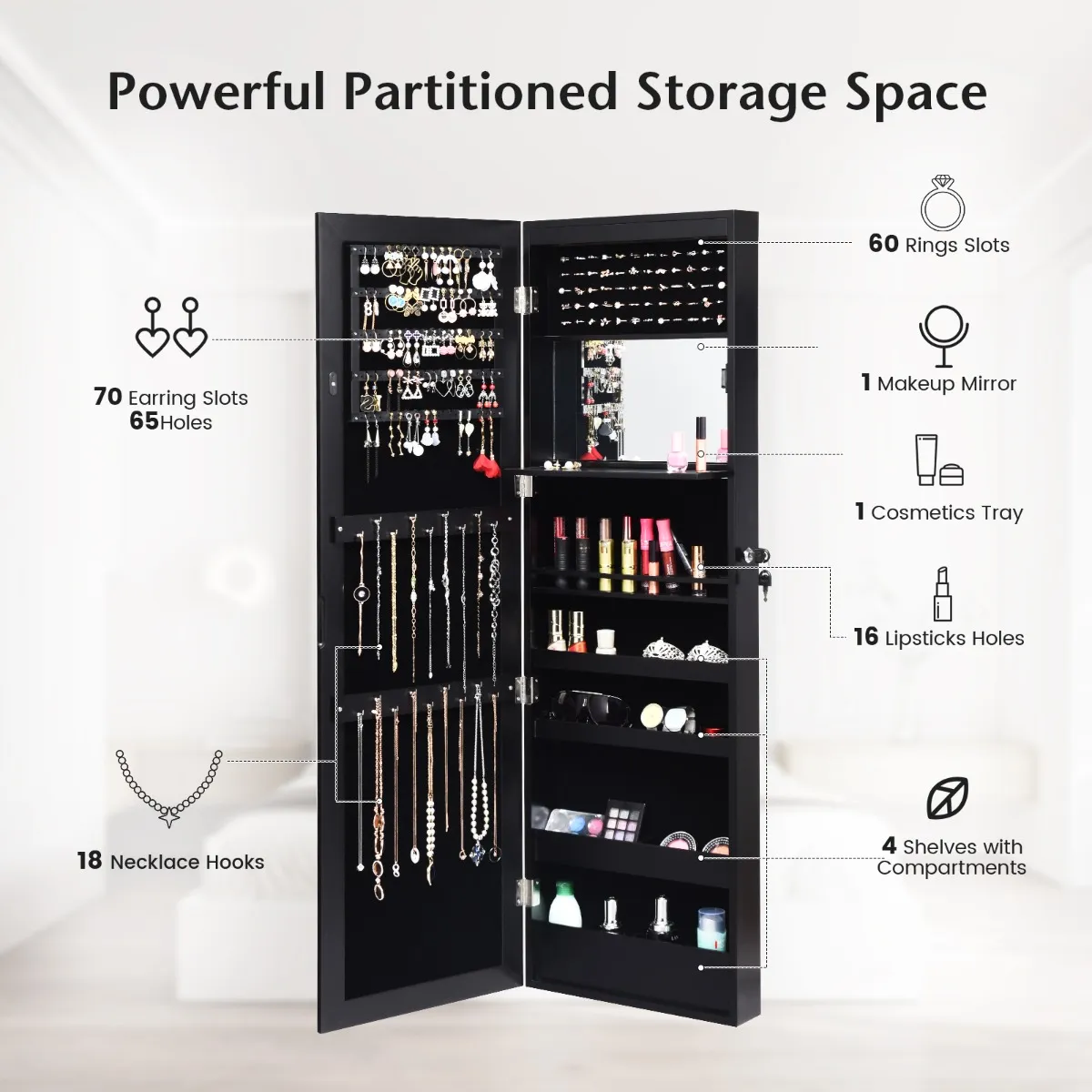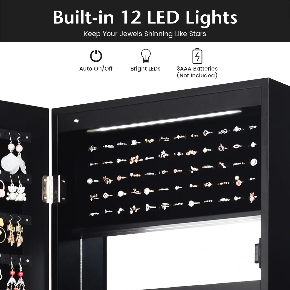 Onze led-sieradenkast met spiegel kan multifunctioneel met spiegel, deur en ledlicht worden gecombineerd en wordt zo een opvallend kunstwerk dat speciaal voor al je waardevolle spullen is ontworpen. De sieradenkast helpt je om je sieraden georganiseerd te bewaren en voorkomt dat ze in de war raken. Het afsluitbare ontwerp beschermt je sieraden tegen ondeugende kinderen. De ingebouwde 12 ledlampen zorgen voor een vleugje luxe en verfraaien je sieraden in de kast. De zwarte fluwelen voering beschermt de sieraden effectief tegen krassen en kan ook gemakkelijk met een zachte, droge doek worden onderhouden. De sieradenkast is praktisch voor het uitproberen van je kleding of sieraden, als je een uitstapje voorbereidt of aan een formeel evenement deelneemt. Bovendien past het chique en elegante design bij de inrichting van je slaapkamer.
