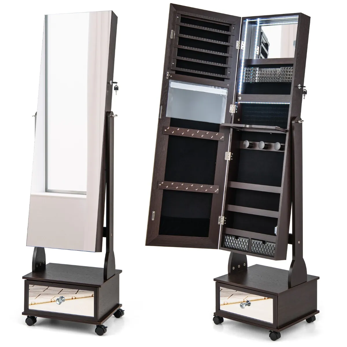 Deze vrijstaande juwelenkast is ontworpen met een spiegel over de hele lengte en een binnenspiegel omringd door 3-kleuren LED-verlichting. Op de uitklapbare make-up plank van acryl kun je sieraden of cosmetica leggen als je je aan het aankleden bent. Het heeft haken, sleuven, planken, lades en meer om al je sieraden en cosmetica netjes op te bergen. De spiegel over de hele lengte kan in 3 hoeken worden versteld en de vergrendelbare universele wielen bieden veel flexibiliteit. Hij is veilig met het slot en de 2 bijgeleverde sleutels.