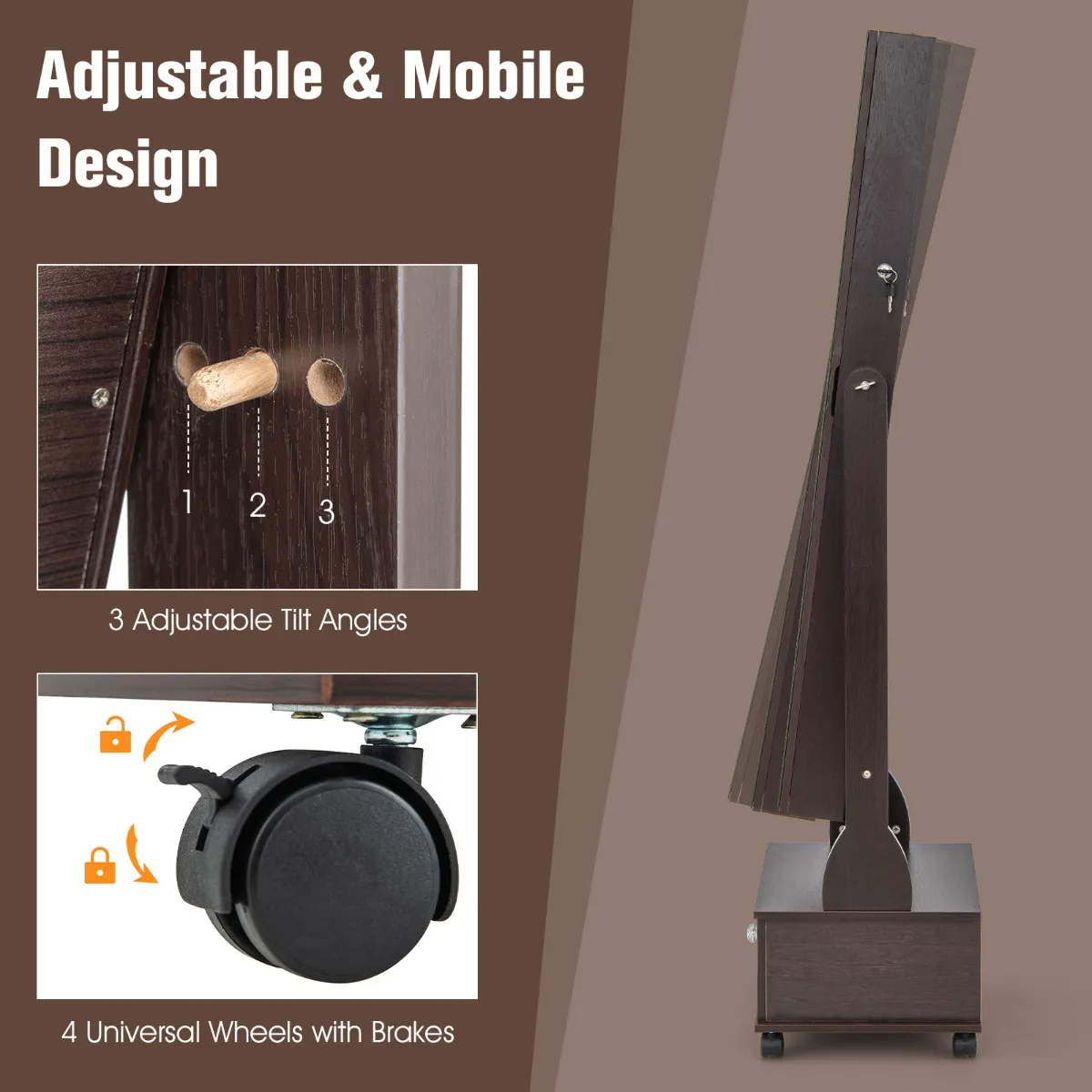 Verstelbaar, mobiel ontwerp: De spiegel van 120 cm x 37 cm over de hele lengte heeft 3 verstelbare kantelhoeken, waardoor je een perfect zicht hebt van top tot teen. 4 universele wielen met remmen maken hem gemakkelijk te verplaatsen, of je kunt de kast aan de muur bevestigen met behulp van de meegeleverde anti-kantelvoorziening.