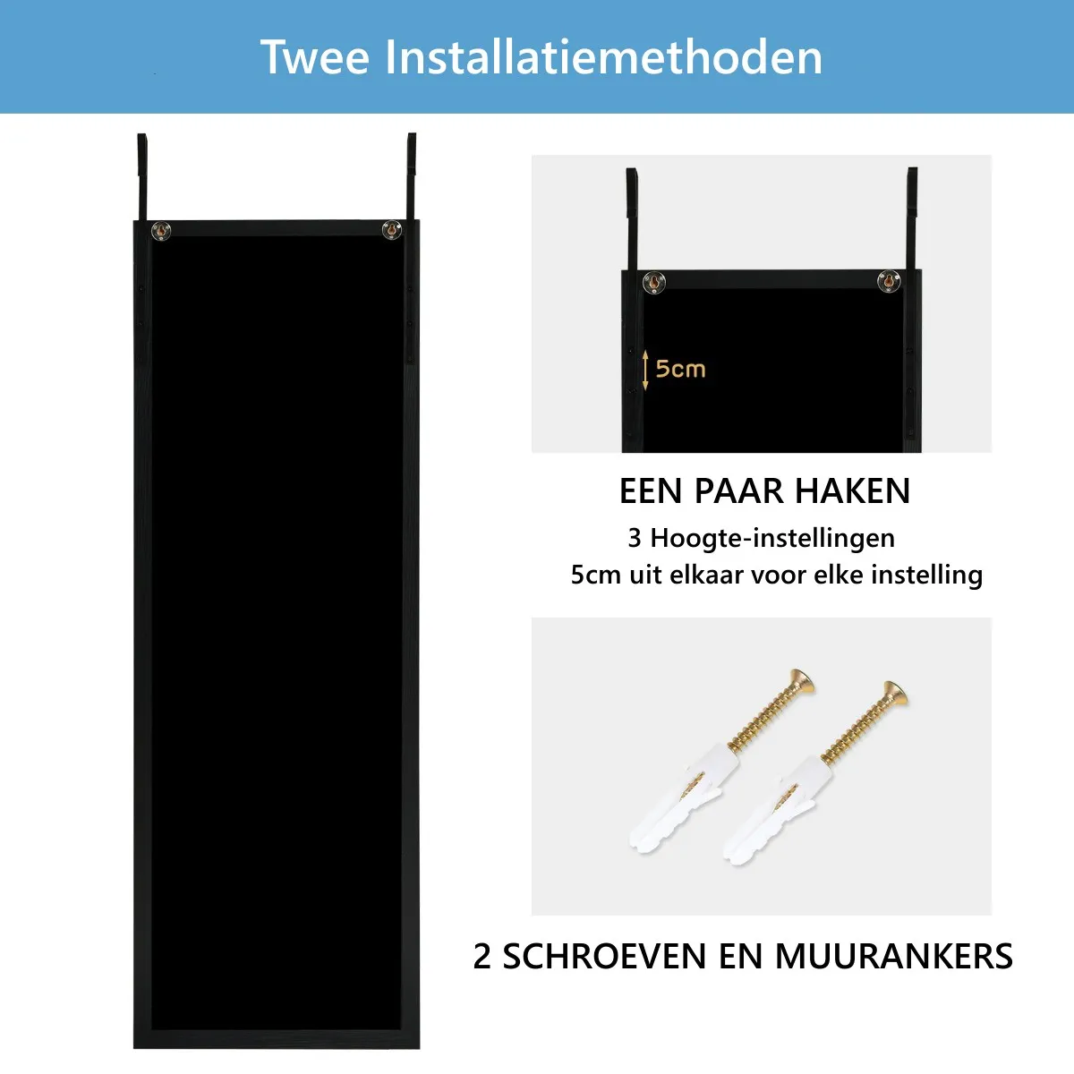 Ruimtebesparend ontwerp: U kunt de spiegel aan de deur hangen met de haken of aan de muur bevestigen met de schroeven. Daardoor neemt hij geen vloeroppervlak in beslag en is hij bijzonder ruimtebesparend.