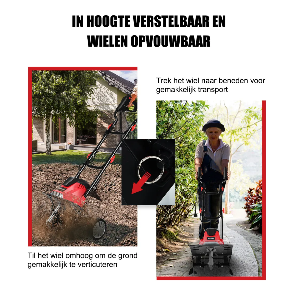 De cultiver met disselboom heeft een krachtige motor van 10 ampère en vier messen om gemakkelijk werk uit te voeren zoals onkruid wieden, composteren en mulchen of de grond te beluchten. Beter dan andere conventionele gazons op benzine, houdt hij rekening met milieubescherming. Intelligente handgrepen met veiligheidsschakelaars garanderen de veiligheid, zelfs rond kwetsbare planten. Bovendien maakt het ontwerp op wielen en opvouwbaar het gemakkelijk te vervoeren en op te bergen. Geniet van uw tuinwerk!