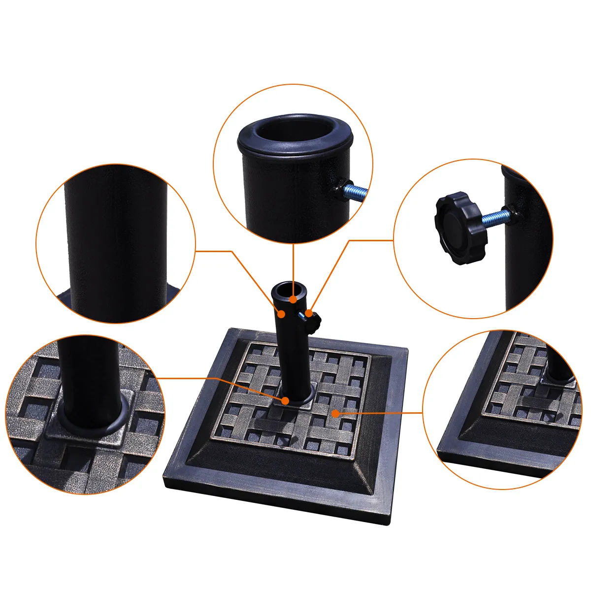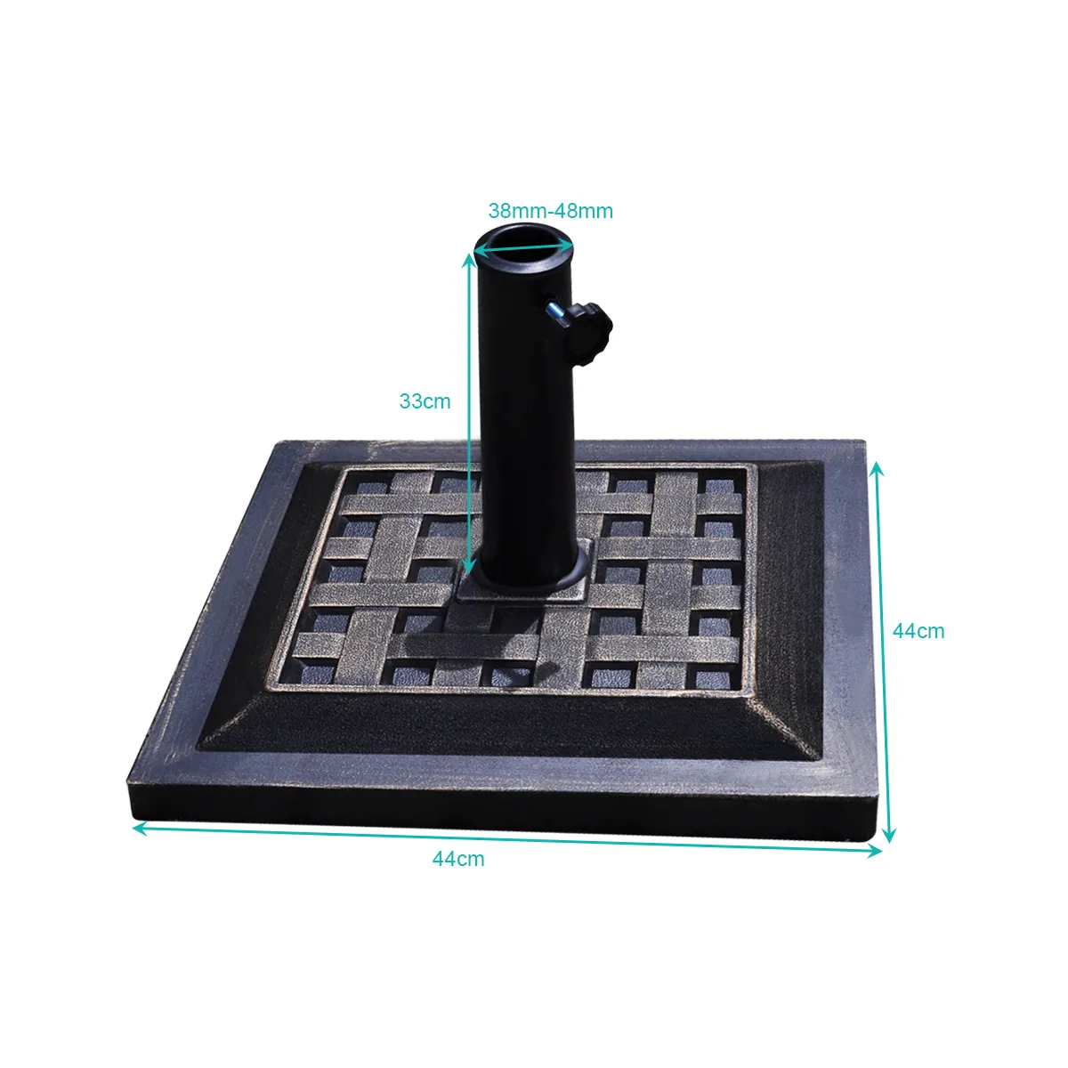 【Klassieke ronde parasolvoet】44cm de vierkante parasolvoet is geschikt voor de meeste openlucht paraplu’s. Dergelijke klassieker zal nooit uit de tijd zijn. Vierkante decoratieve patroon plus bronzen afwerking maken uw parasols veel aantrekkelijker.