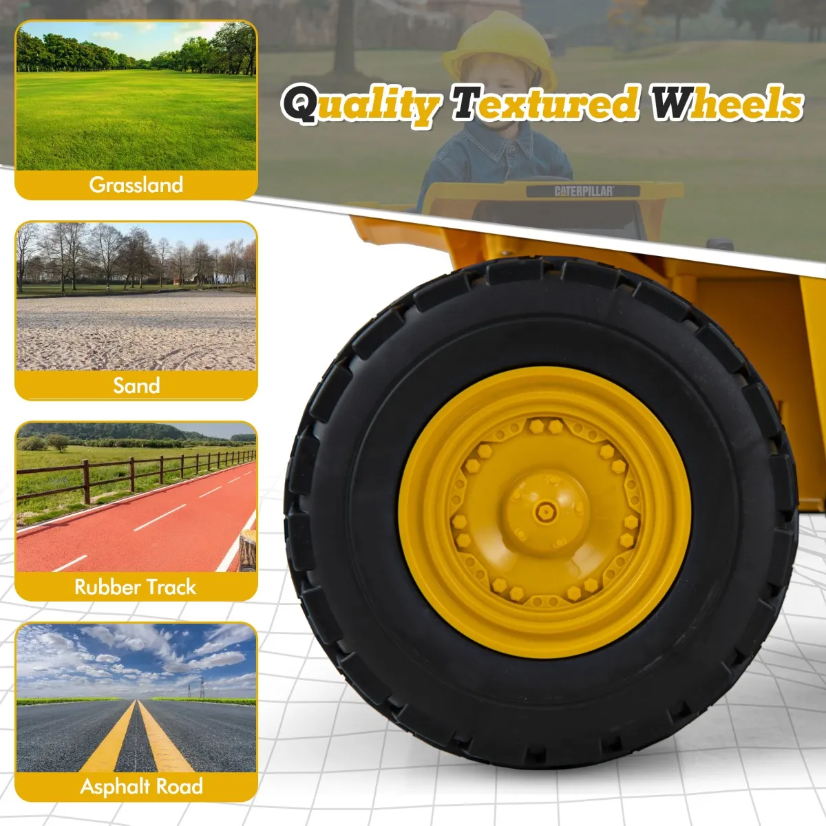 【Vrachtwagen met Caterpillar-licentie voor kinderen】 Met heldere koplampen en verstelbare achteruitkijkspiegels ziet ons kindervoertuig met Caterpillar-licentie eruit als een echte kiepwagen, die de aandacht van kinderen trekt. Uitgerust met een oplaadbare 12V-batterij, zorgt hij voor een veilige snelheid van 3-4 km/u.