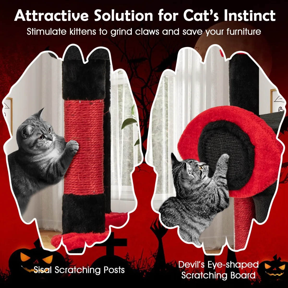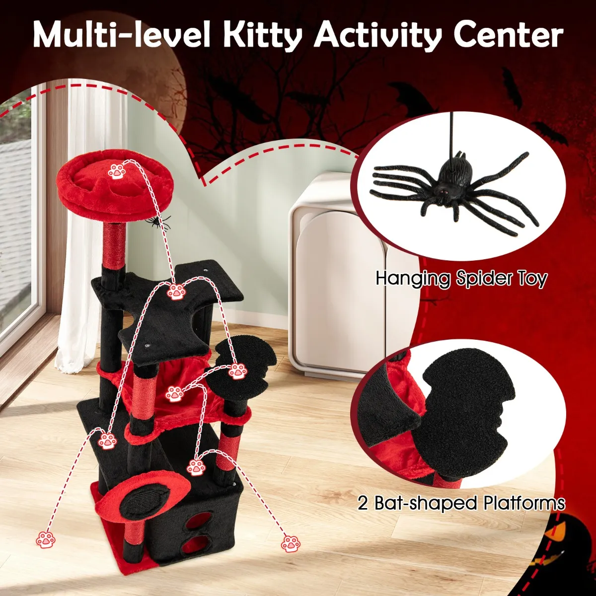 【Mysterieus gothic-thema】: De zwarte stof in combinatie met de pluche rode kussens biedt een opvallend visueel contrast. Bovendien dragen de eigenzinnige elementen zoals het spinnenspeelgoed, de vleermuisvormige platforms, het sisalbord in duivelsokkenvorm en het uitzichtplatform in duivels-oorvorm bij aan het griezelige thema van de toren.