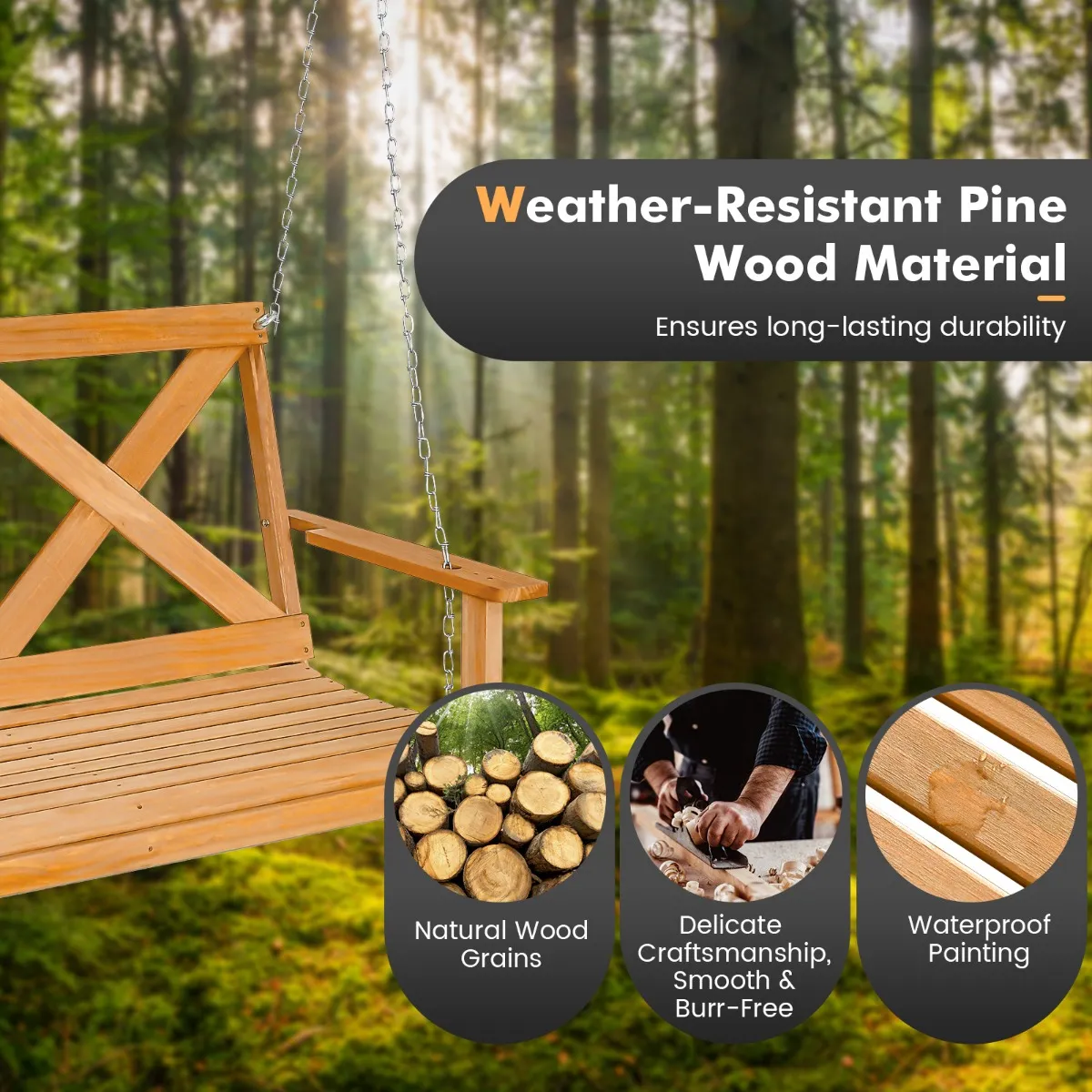 Weerbestendig grenen materiaal: De terrasschommel is gemaakt van sterk kromtrekbestendig grenenhout, waardoor duurzaamheid gegarandeerd is, en het houtoppervlak is gecoat met waterbestendige verf, waardoor het er niet alleen elegant uitziet, maar ook wordt voorkomen dat het wordt beschadigd door het weer.