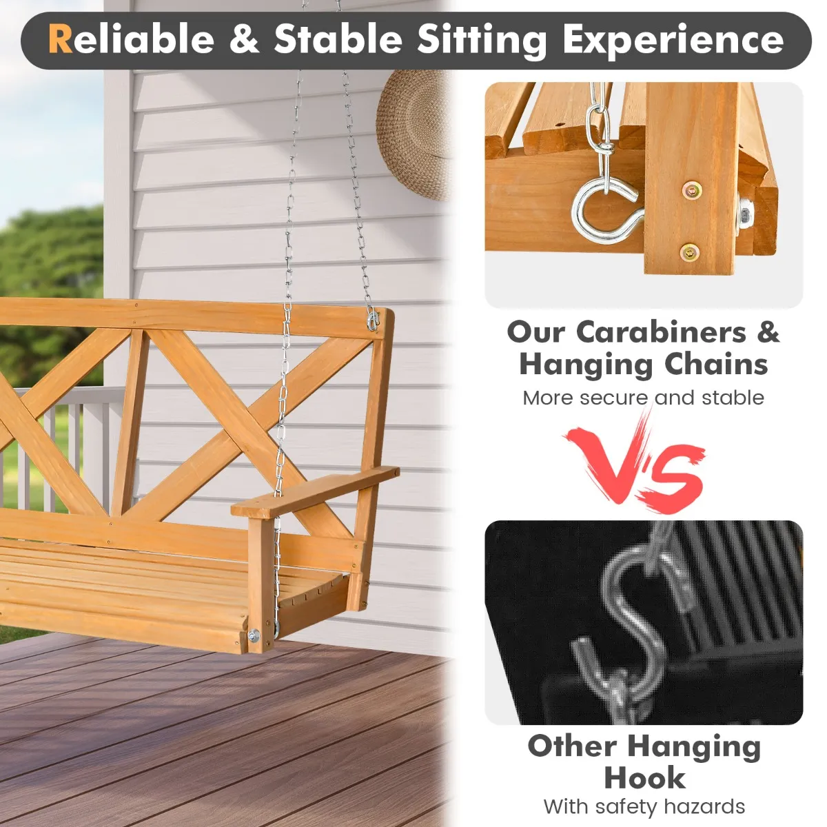 Betrouwbare en stabiele zitervaring: In tegenstelling tot andere ophanghaken met veiligheidsrisico’s, maakt onze terrasschommel gebruik van stevige karabijnhaken en ophangkettingen, die veiliger en stabieler zijn, stevige ondersteuning bieden en de veiligheid garanderen wanneer je op de schommel zit.