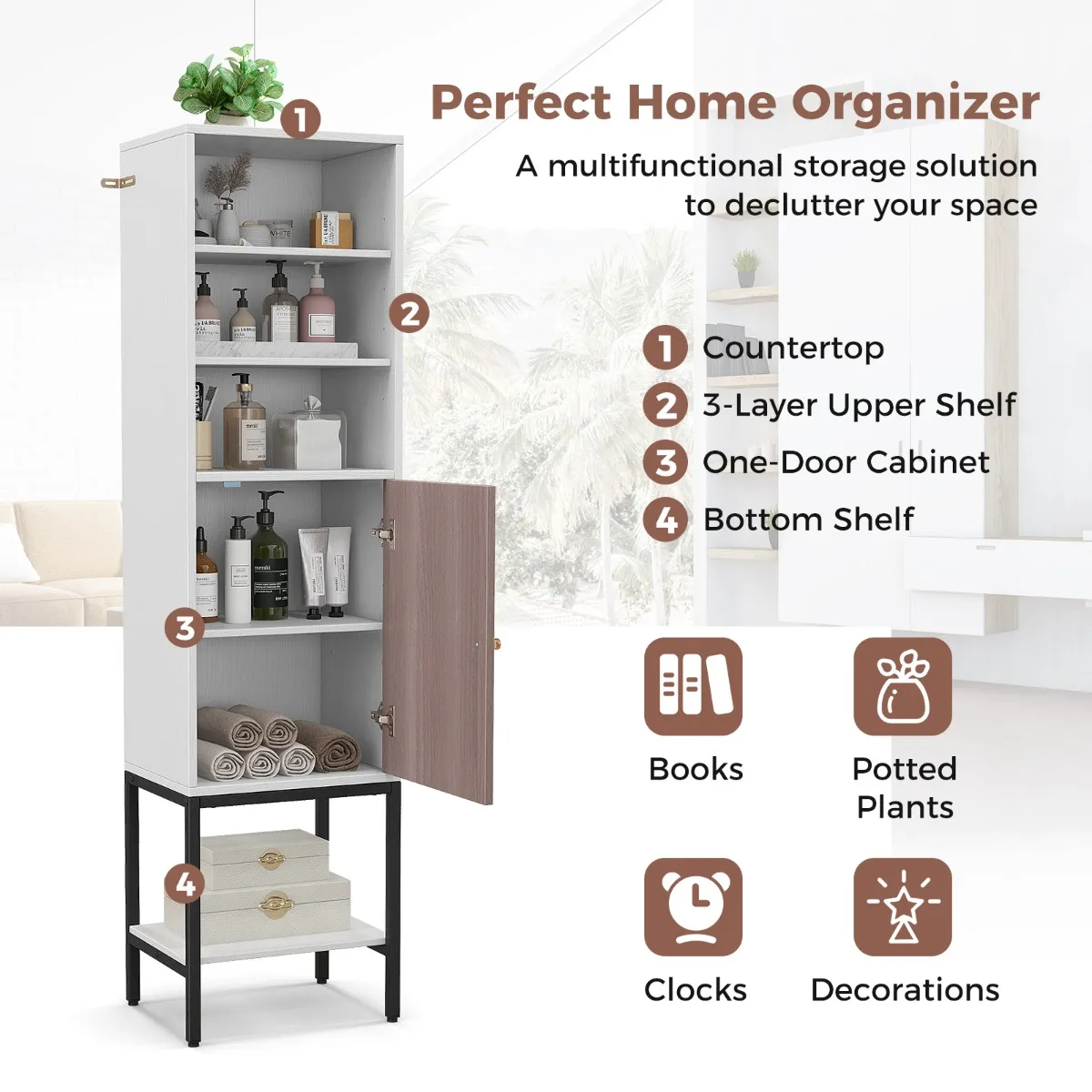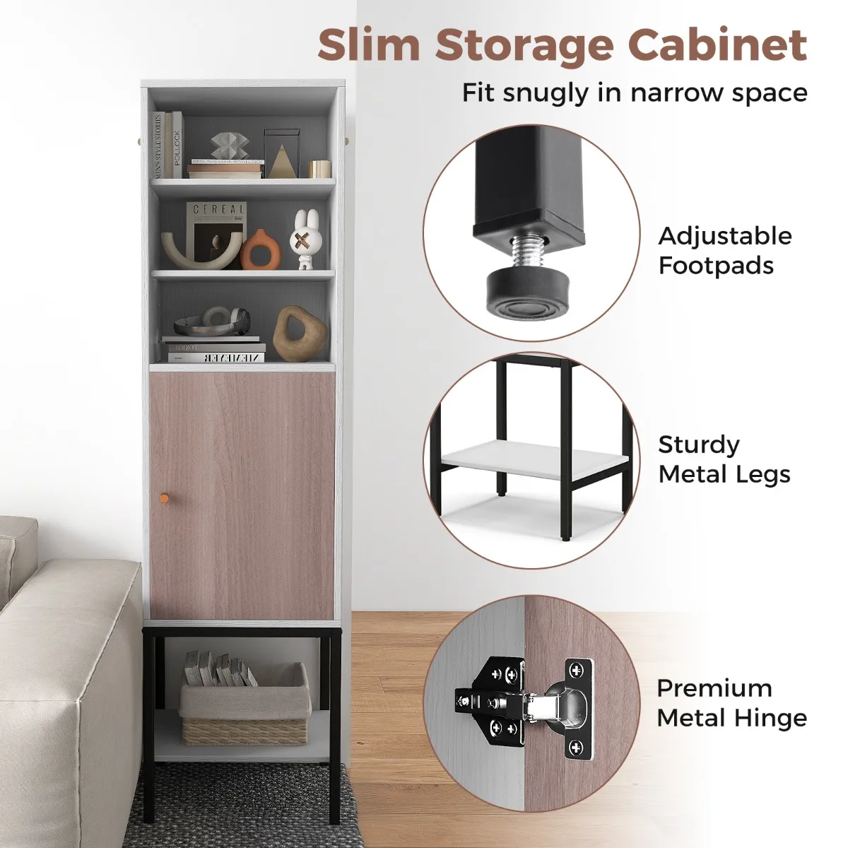 Deze slanke vrijstaande kast is 146 cm hoog en heeft een aanrechtblad, 3 bovenste planken, een kast met een deur en een onderste plank voor veel opbergruimte. Hij past in krappe ruimtes in huizen, kantoren of commerciële ruimtes. De legplanken zijn verstelbaar op verschillende niveaus om plaats te bieden aan spullen van elk formaat. Hij is gebouwd met metalen poten en voorzien van een anti-kantelset voor stabiliteit en veiligheid. Verander je ruimte in een georganiseerde, efficiënte en stijlvolle omgeving met deze kledingkast.