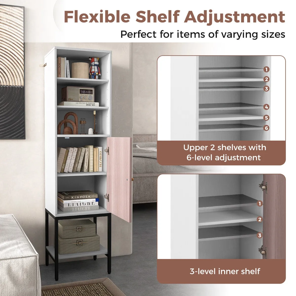 Flexibele schapverstelling : De 2 bovenste schappen met 6 standen en de binnenste plank met 3 standen zorgen ervoor dat je de ruimte kunt aanpassen aan je behoeften. Dit functionele ontwerp is perfect voor spullen van verschillende afmetingen, van boeken tot omvangrijke apparatuur.
