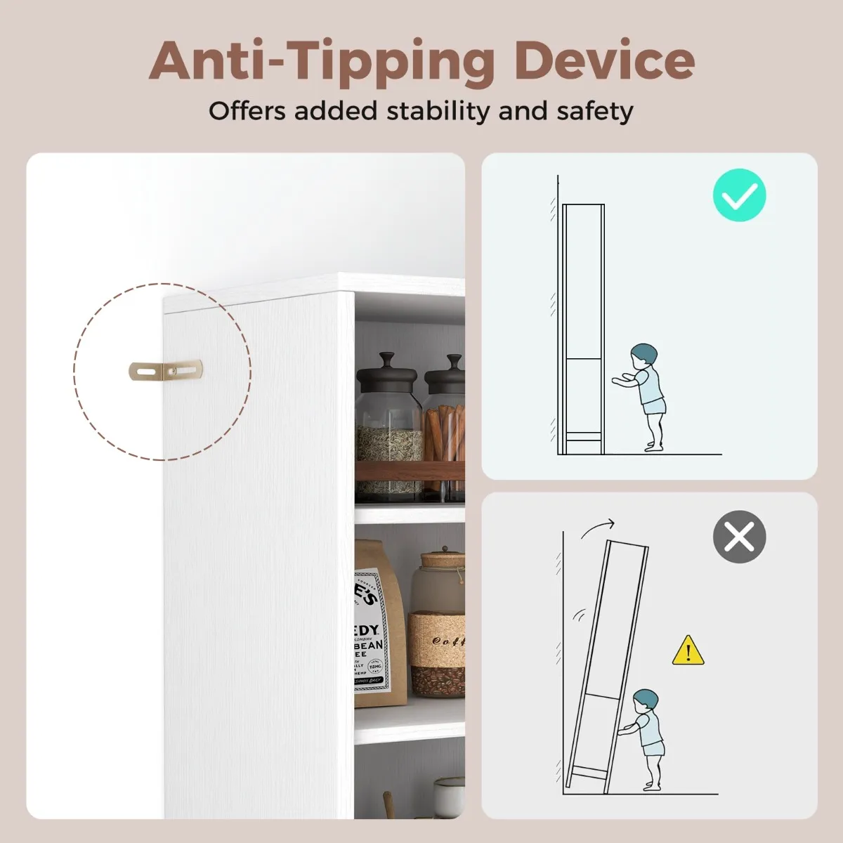 Stevige metalen steun : Gebouwd met stevige metalen poten, belooft deze kast extra stabiliteit en duurzaamheid. Bovendien verhoogt de kantelbeveiliging de veiligheid.