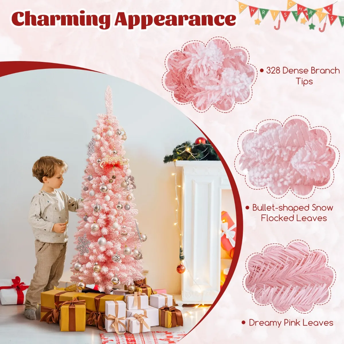 Met 328 dichte takpunten en sierlijke roze bladeren creëert deze slanke kerstboom een dromerige en sfeervolle ambiance. De bolvormige en besneeuwde bladeren zorgen voor een winterse uitstraling, waardoor de boom een echte eyecatcher is in je kerstdecoratie. Â