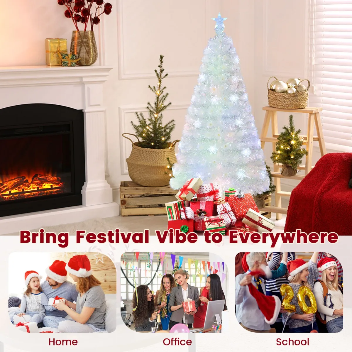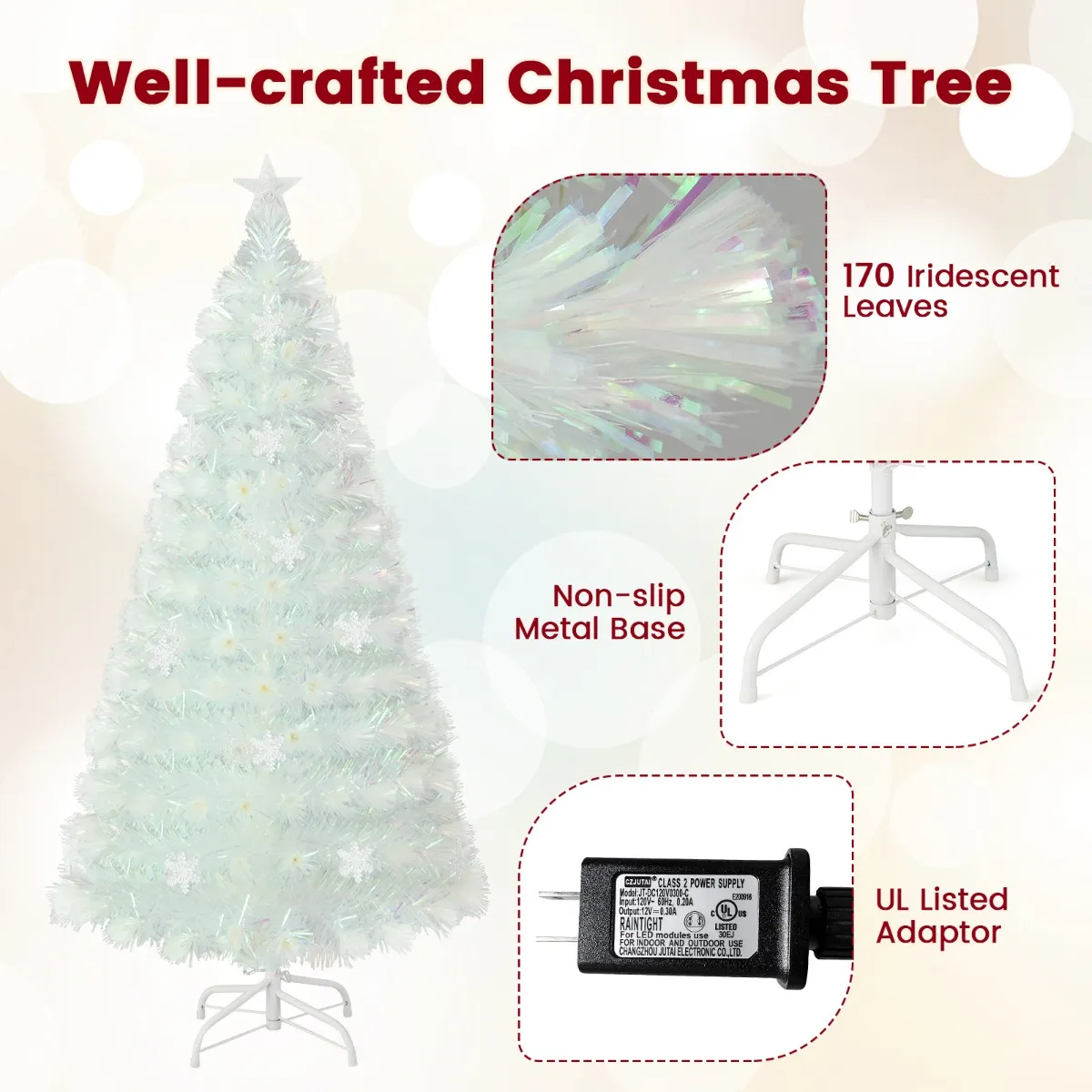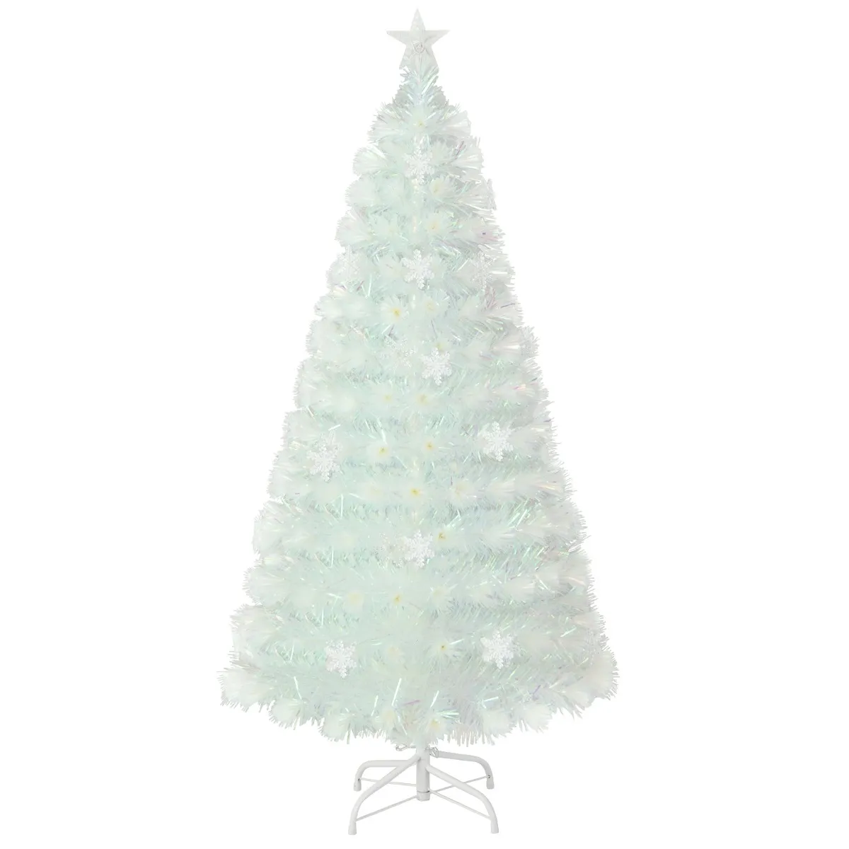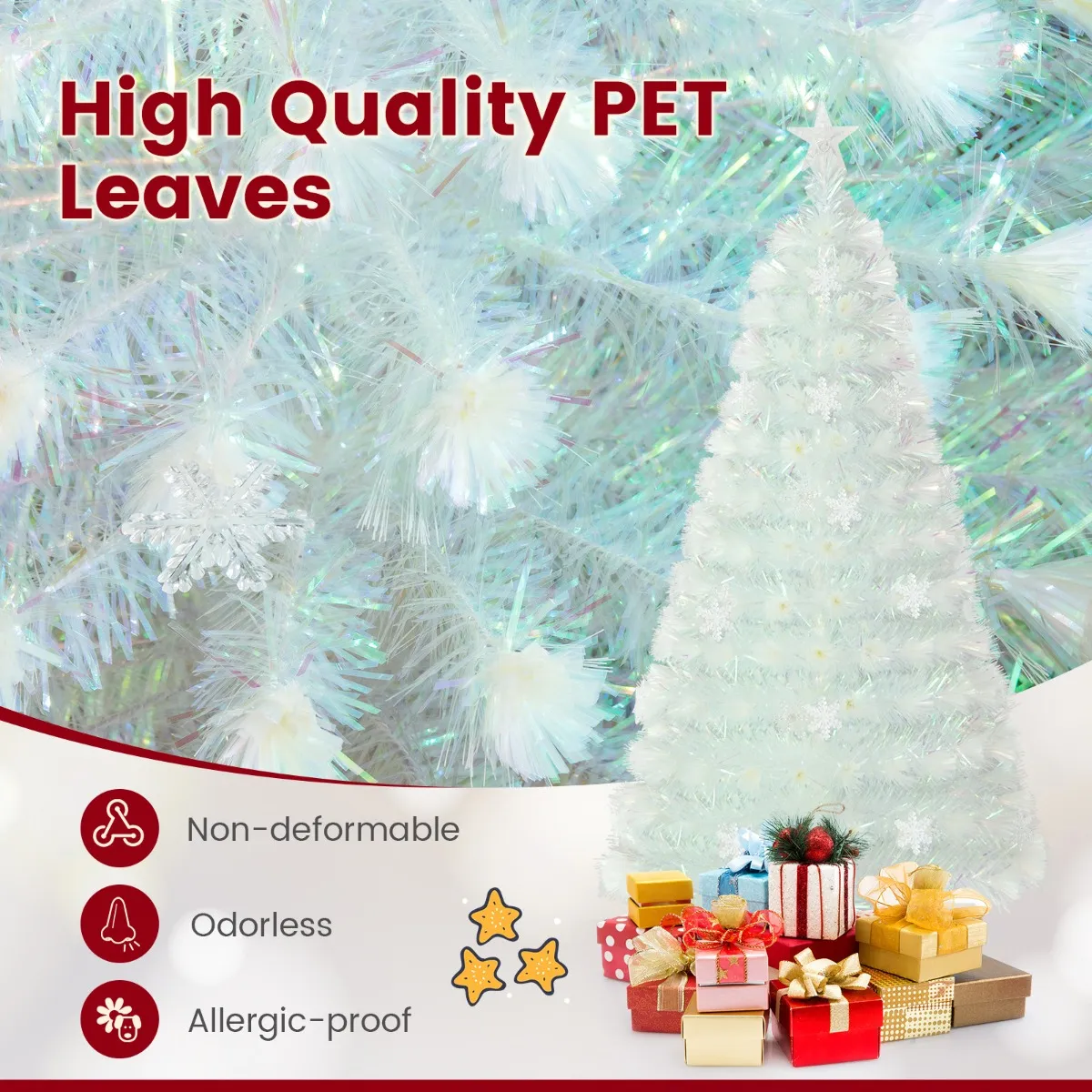 Creëer een magische kerstsfeer met onze prachtige witte, voorgesneden kerstboom van glasvezel. Deze prachtige geheel witte kerstboom heeft 170 weelderige takpunten en glinsterende iriserende bladeren die voor een betoverende visuele aantrekkingskracht zorgen. En met zijn veelkleurige sneeuwvlok-LED-verlichting, meerkleurig sterrenlicht aan de bovenkant en gloeiende glasvezel biedt deze verlichte kerstboom een boeiend kerstverlichtingsdisplay. Het is gemaakt van hoogwaardig materiaal, garandeert duurzaamheid en geeft een elegante toets aan uw feestelijke decoratie. De boom wordt geleverd met een gekruiste metalen standaard die de boom rechtop houdt en breuk voorkomt. Of het nu voor uw huis, kantoor of evenement is, deze witte kerstboom creëert magische herinneringen en behoudt de kerstsfeer van uw feesten.