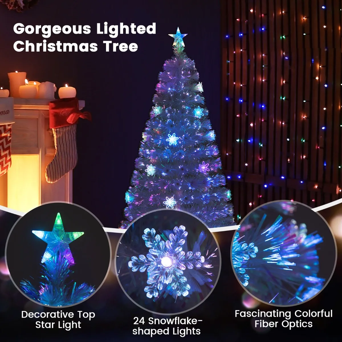 【Gevarieerde lichtdecoraties】: De voorverlichte kerstboom is versierd met glinsterende lichtvezels en 24 meerkleurige LED-sneeuwvloklichten, die een betoverende lichtshow bieden die ieders aandacht zal trekken. Bovendien zit er aan de bovenkant een veelkleurig sterrenlicht dat de aantrekkelijkheid vergroot.