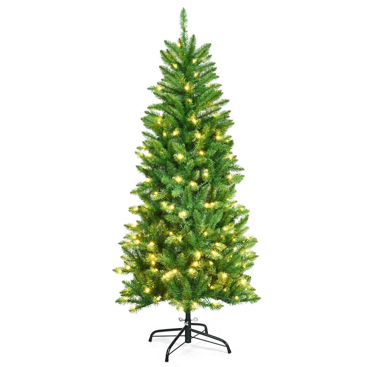 Geloof dat deze kerstboom iedereen geluk en zegen zal brengen tijdens de zinvolle kerstperiode. Hij is uitgerust met 150 warmwitte LED-lampjes die fel schijnen. Het slanke ontwerp neemt niet te veel vloeroppervlak in beslag en waar je het ook plaatst, zoals bij de deur, open haard, trap, eetkamer, enz., het zal de perfecte decoratie zijn. Ondertussen brengt de groene kleur een vleugje levendigheid in de kamer. Hij is binnen enkele minuten opgezet met de handige scharnierende delen en wordt rechtop gehouden met de meegeleverde stevige metalen standaard. Schakel de felle lichten in om van de kerstsfeer te genieten. De LED-verlichting is CE-gecertificeerd en de boom is gemaakt van 100% nieuw PVC, dus uw veiligheid is gegarandeerd.