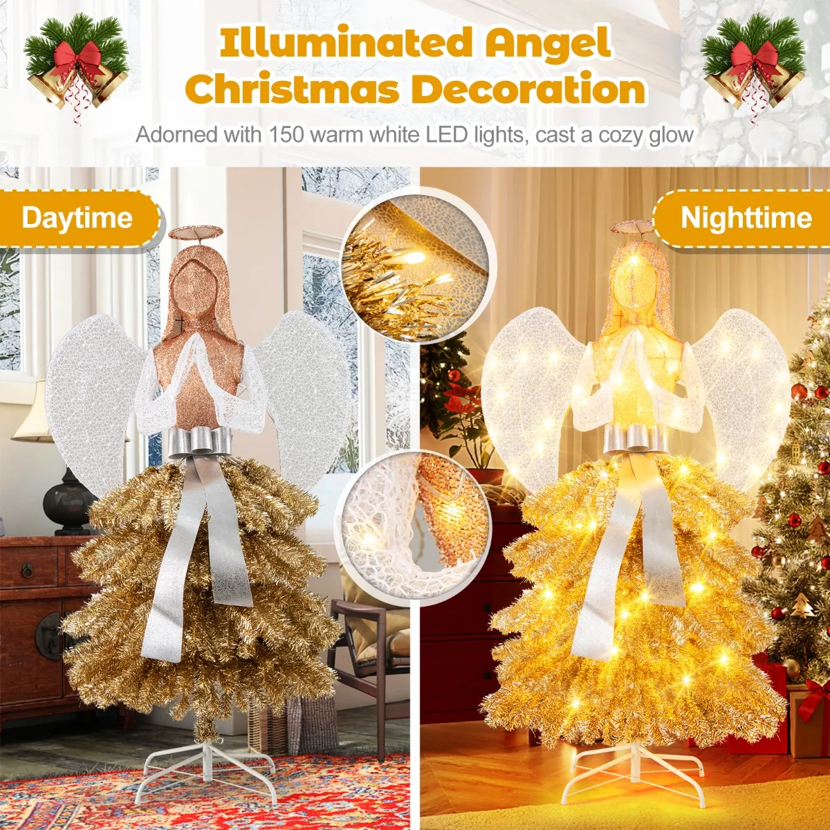 【Aantrekkelijk en elegant】: Deze fascinerende kerstboom van 157 cm versmelt een goddelijke engelfiguur met een traditionele kerstboom. Het bovenste deel van de engel heeft gebaarde handen, elegante vleugels en een delicate boog, terwijl de onderste kerstboom versierd met glinsterende gouden bladeren een sierlijke rok nabootst.