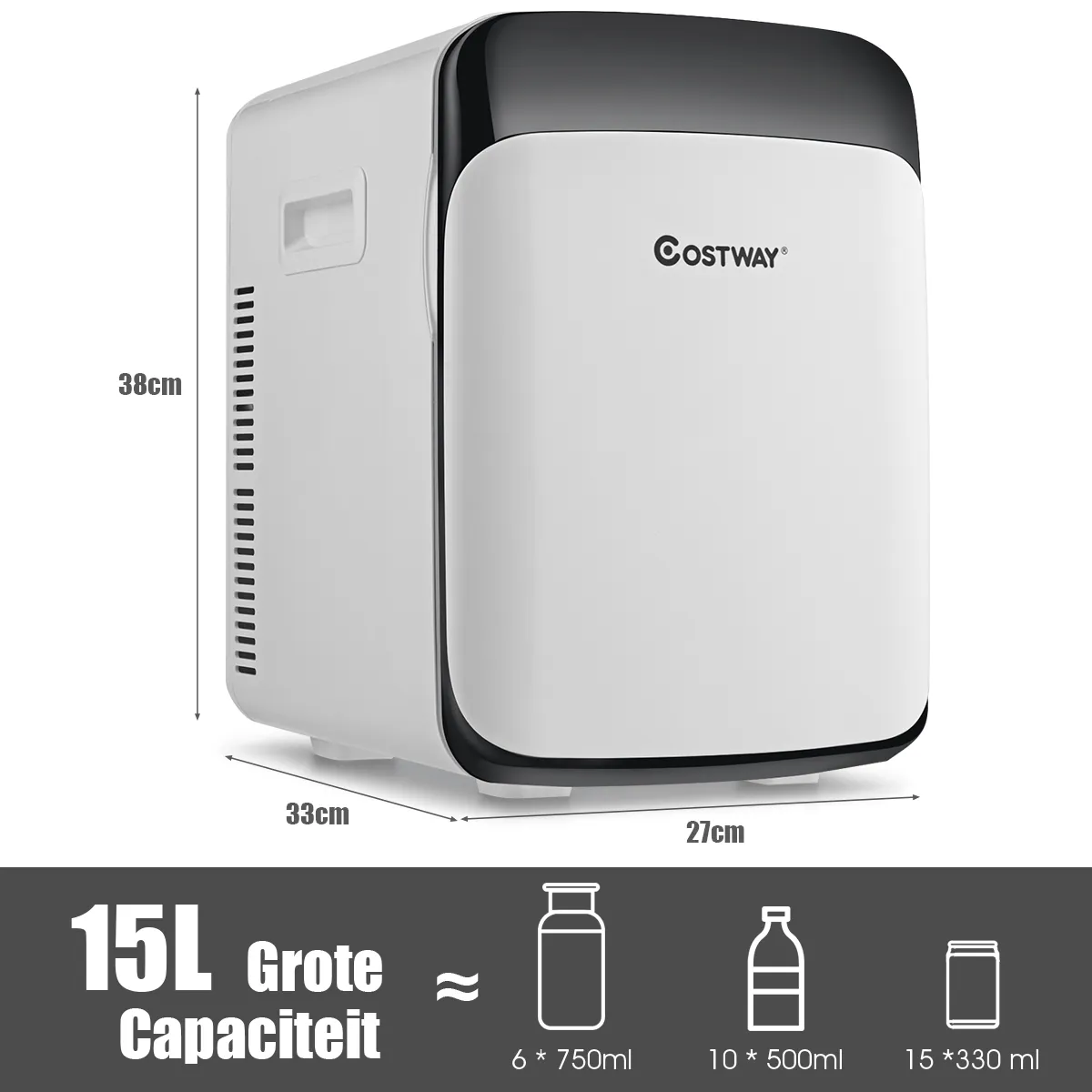 Met een grote capaciteit van 15 liter kunnen dranken en etenswaren gemakkelijk worden bewaard