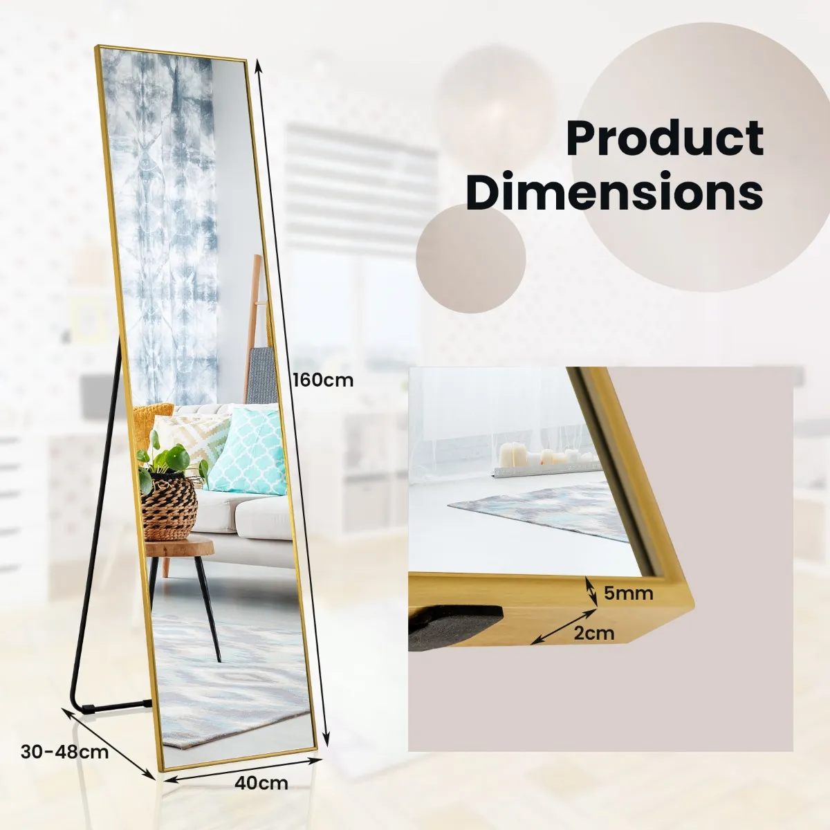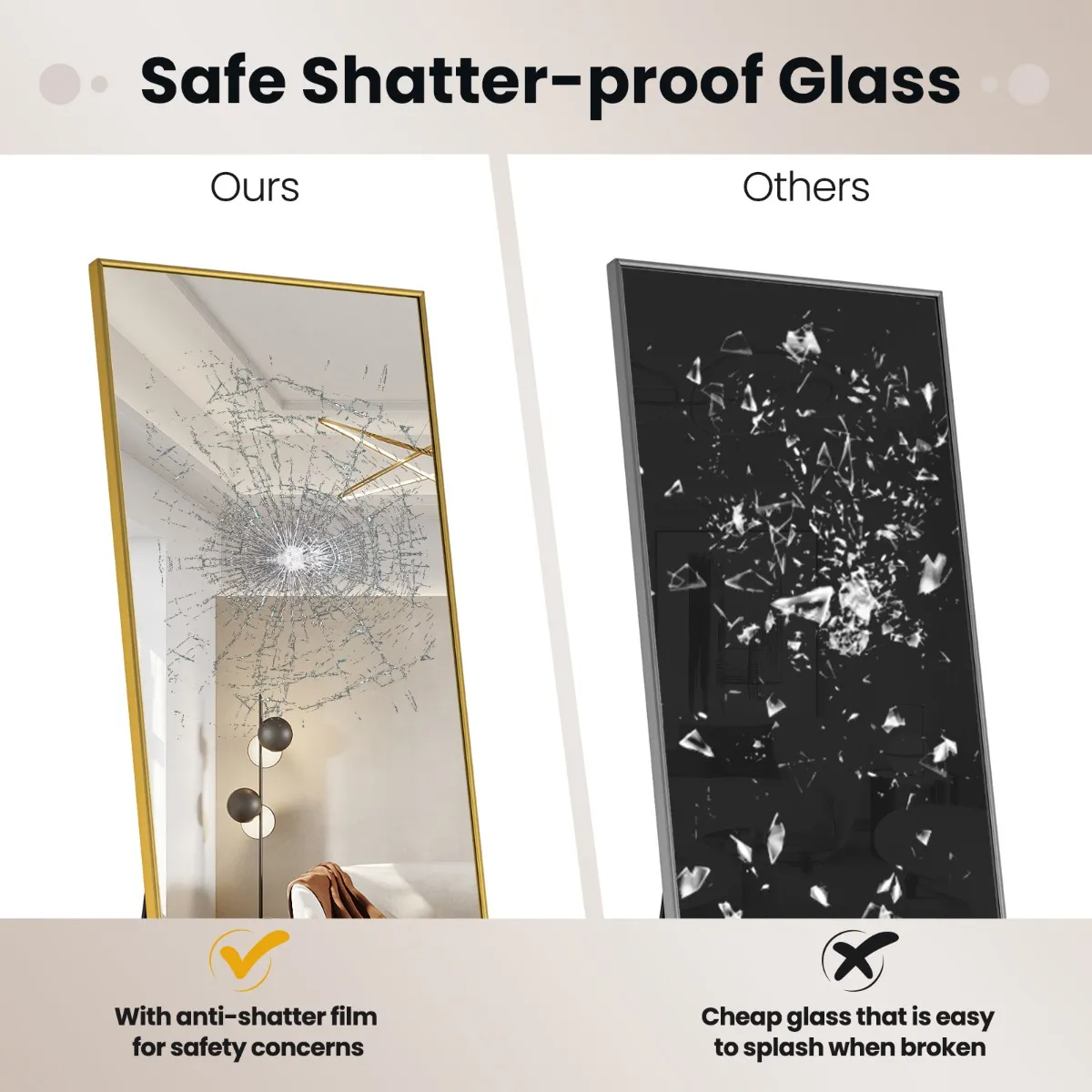 Duurzaam en stijlvol aluminium legering frame: Het hoogwaardige aluminiumlegering frame is roestwerend, lichtgewicht en duurzaam. Bovendien heeft het smalle en slanke frame een chique en stijlvolle uitstraling, waardoor de staande spiegel een aantrekkelijke aanvulling is op de woonkamer, slaapkamer of entree.