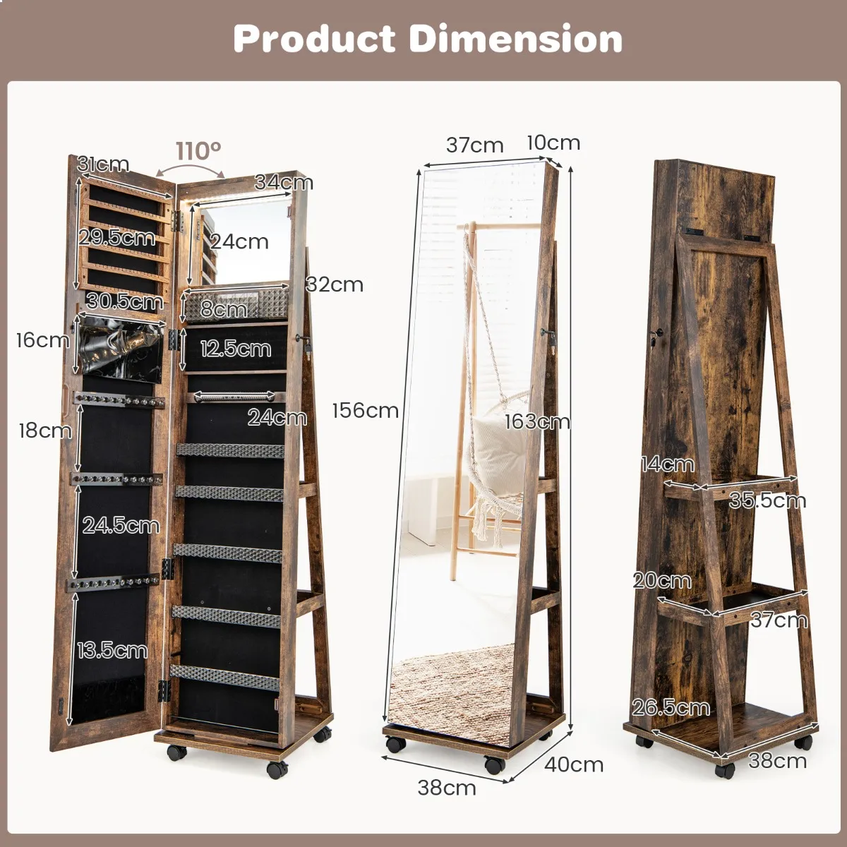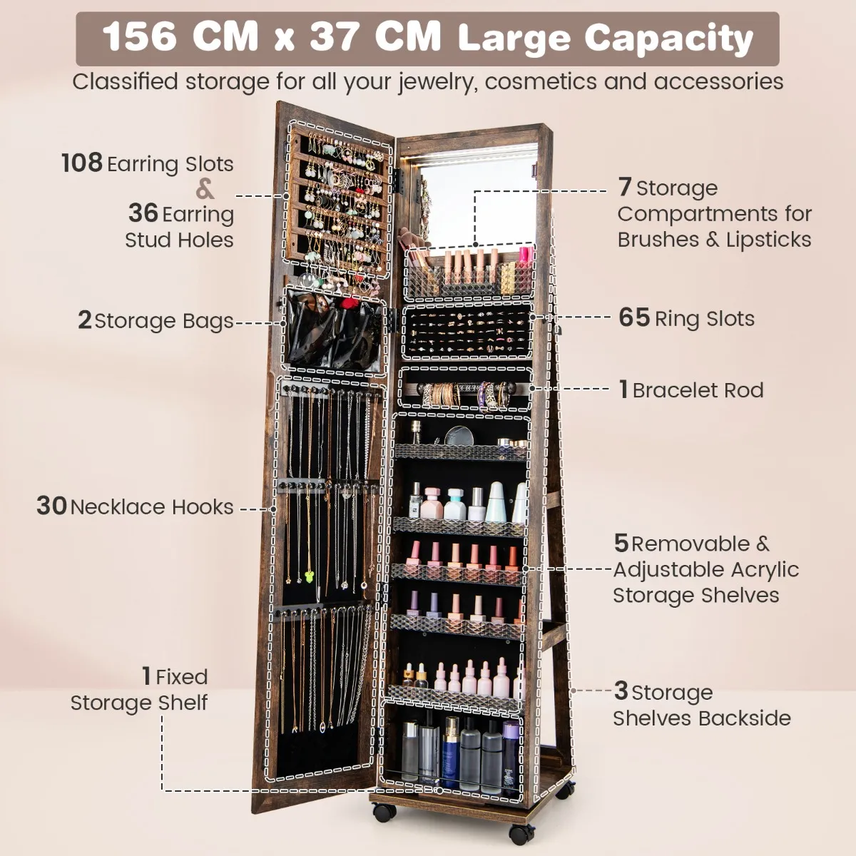 Deze elegante vrijstaande juwelenkast heeft een aantal vakken, haken en planken, en veel opbergruimte voor al je kettingen, oorbellen, ringen en meer. De spiegel over de hele lengte aan de buitenkant laat je je outfit controleren en voegt ook een vleugje elegantie toe aan je kamer. De make-upspiegel aan de binnenkant is uitgerust met heldere 3-kleuren LED-verlichting, waardoor hij praktisch en gemakkelijk in gebruik is. Hij is gemaakt van hoogwaardige materialen, is stevig en duurzaam en gemakkelijk te verplaatsen dankzij de 4 wieltjes.