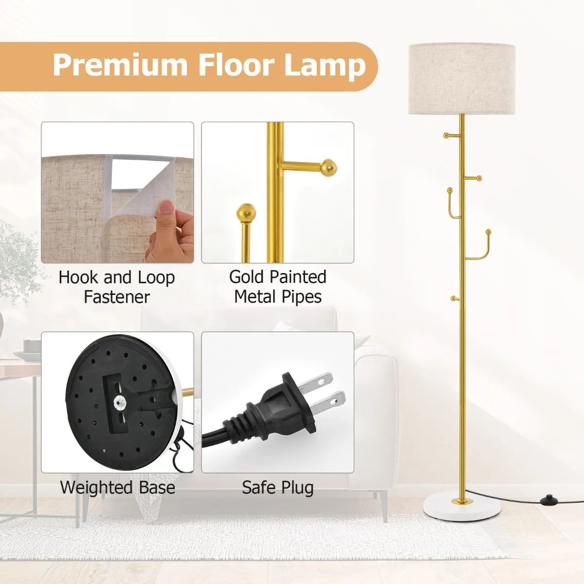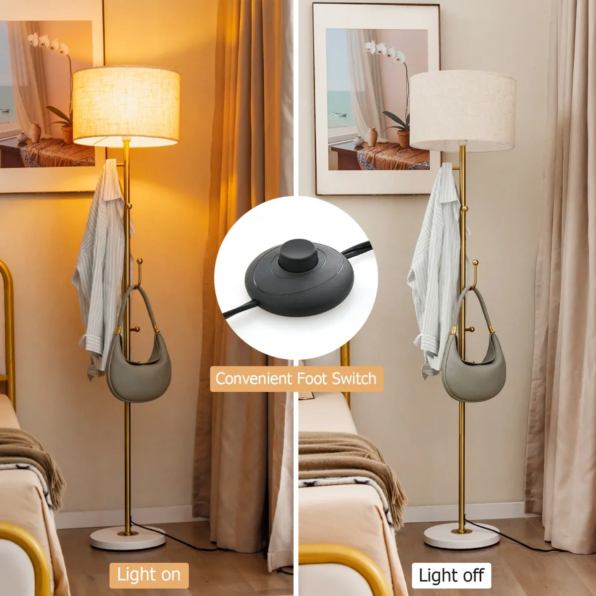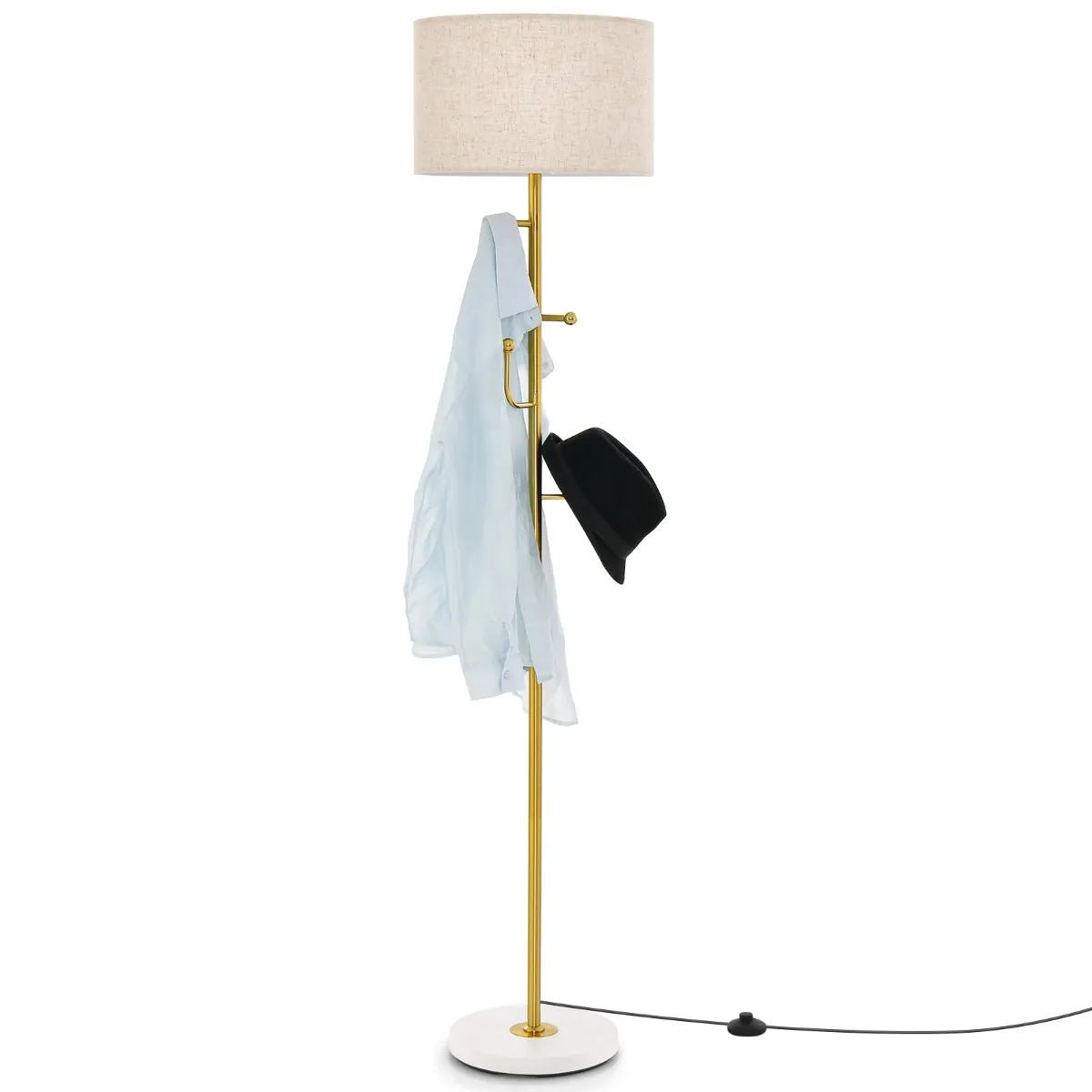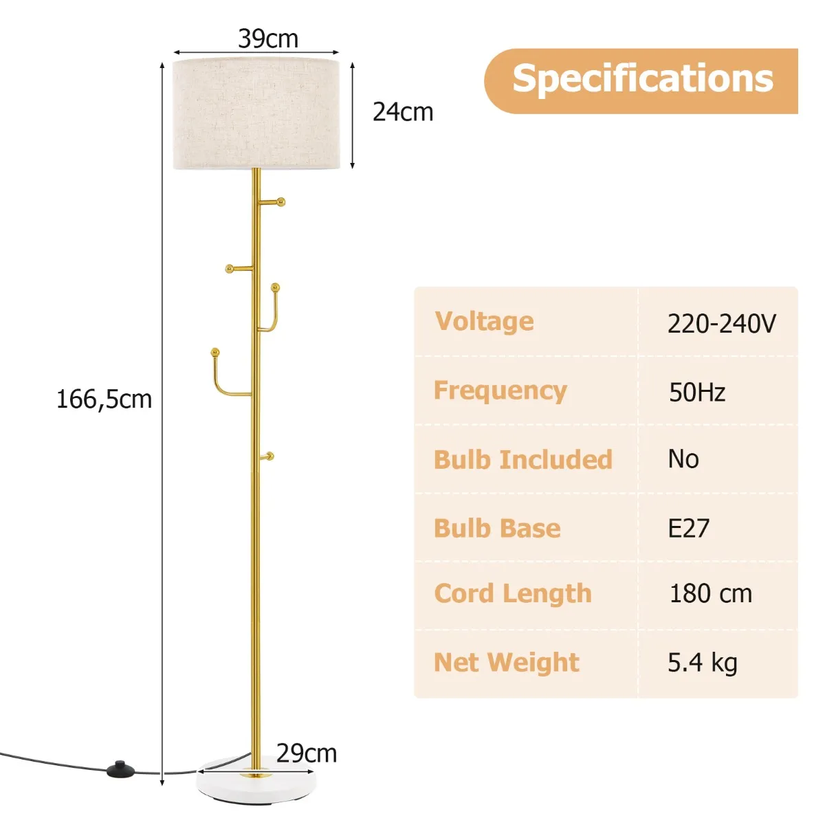 De multifunctionele 2-in-1 vloerlamp combineert praktisch en stijlvol met zijn veelzijdige ontwerp. De lamp heeft 5 haken en een lampje en biedt zowel licht als een praktische plek om je spullen op te hangen. De kap is gemaakt van duurzaam linnen, verzacht het licht en beschermt je ogen voor een rustgevende sfeer. De lamp heeft ook een stevig metalen frame met een verzwaarde voet voor stabiliteit. Zo’n elegante en functionele vloerlamp is geschikt voor verschillende gelegenheden en kan worden gebruikt in kantoren, slaapkamers of gangen.