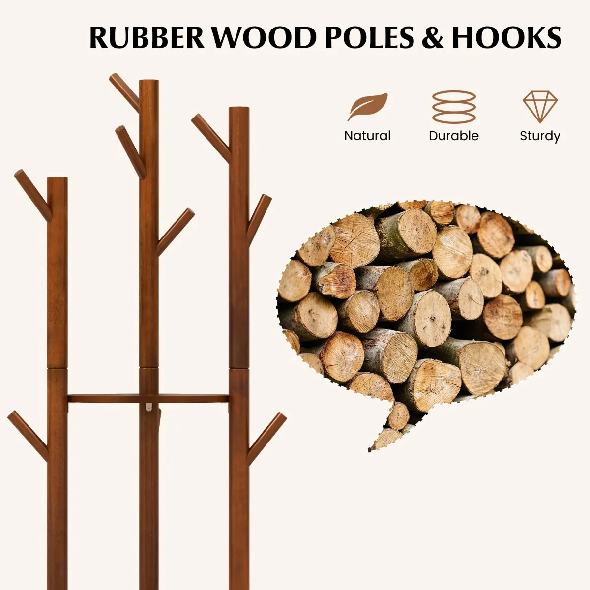 Met zijn 360° draaibare basis maakt deze kapstok het makkelijk om kleding op te pakken of op te hangen. 3 planken en 9 haken voor al je opbergbehoeften. Het braamvrije oppervlak en de afgeronde hoeken beschermen je kleding. De staanders en haken zijn gemaakt van massief rubberhout, waardoor ze jarenlang meegaan. Met zijn verticale structuur neemt het weinig ruimte in beslag en is het perfect voor elke kleine ruimte in je slaapkamer, woonkamer, hal en meer. Bovendien is de installatie eenvoudig met de gebruikershandleiding.