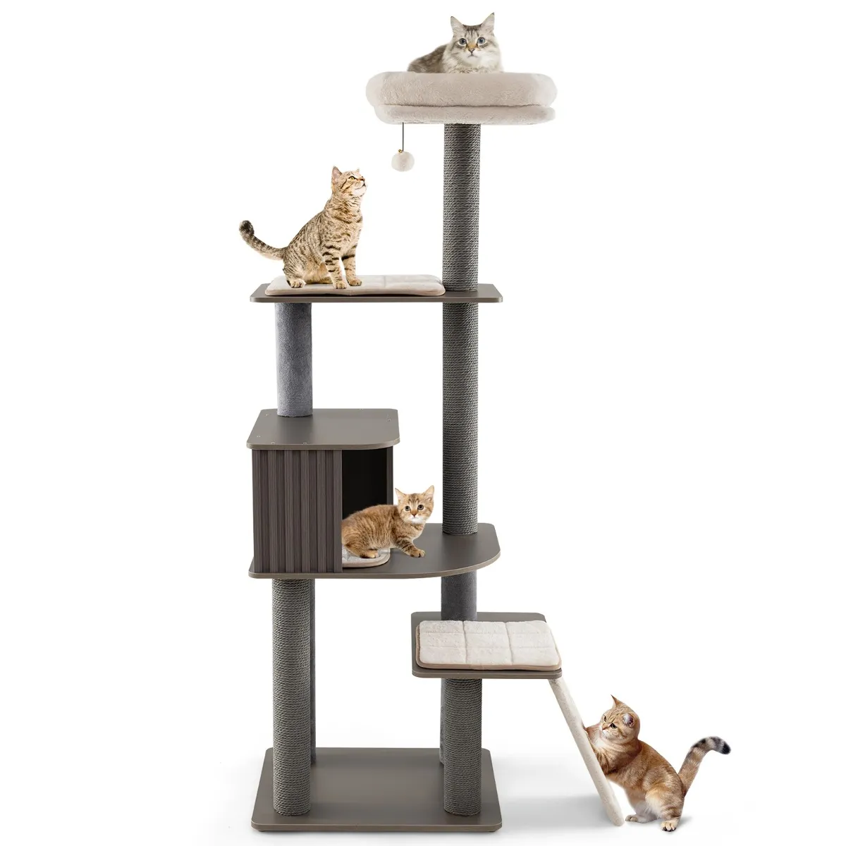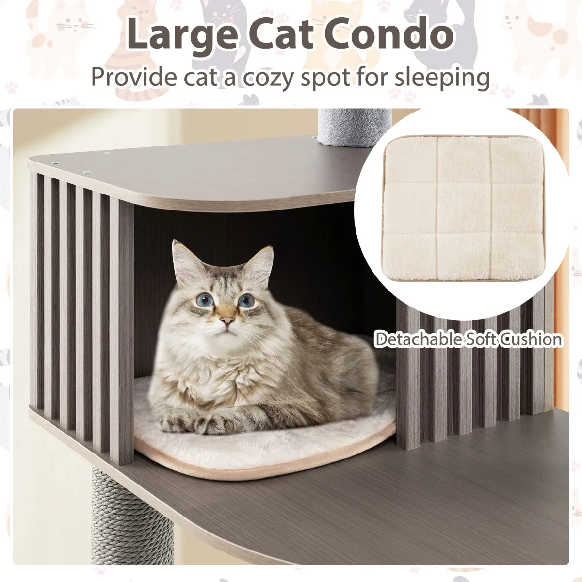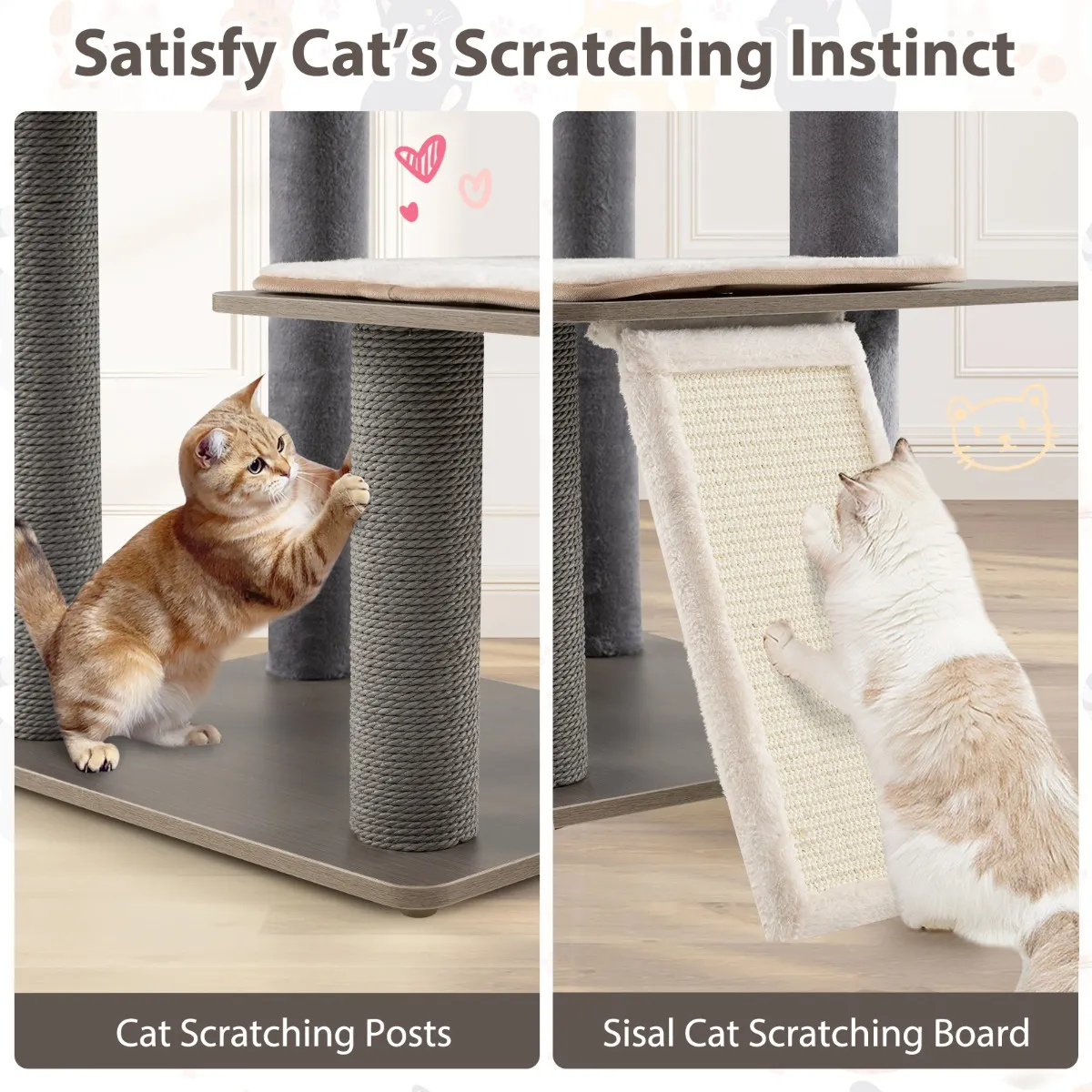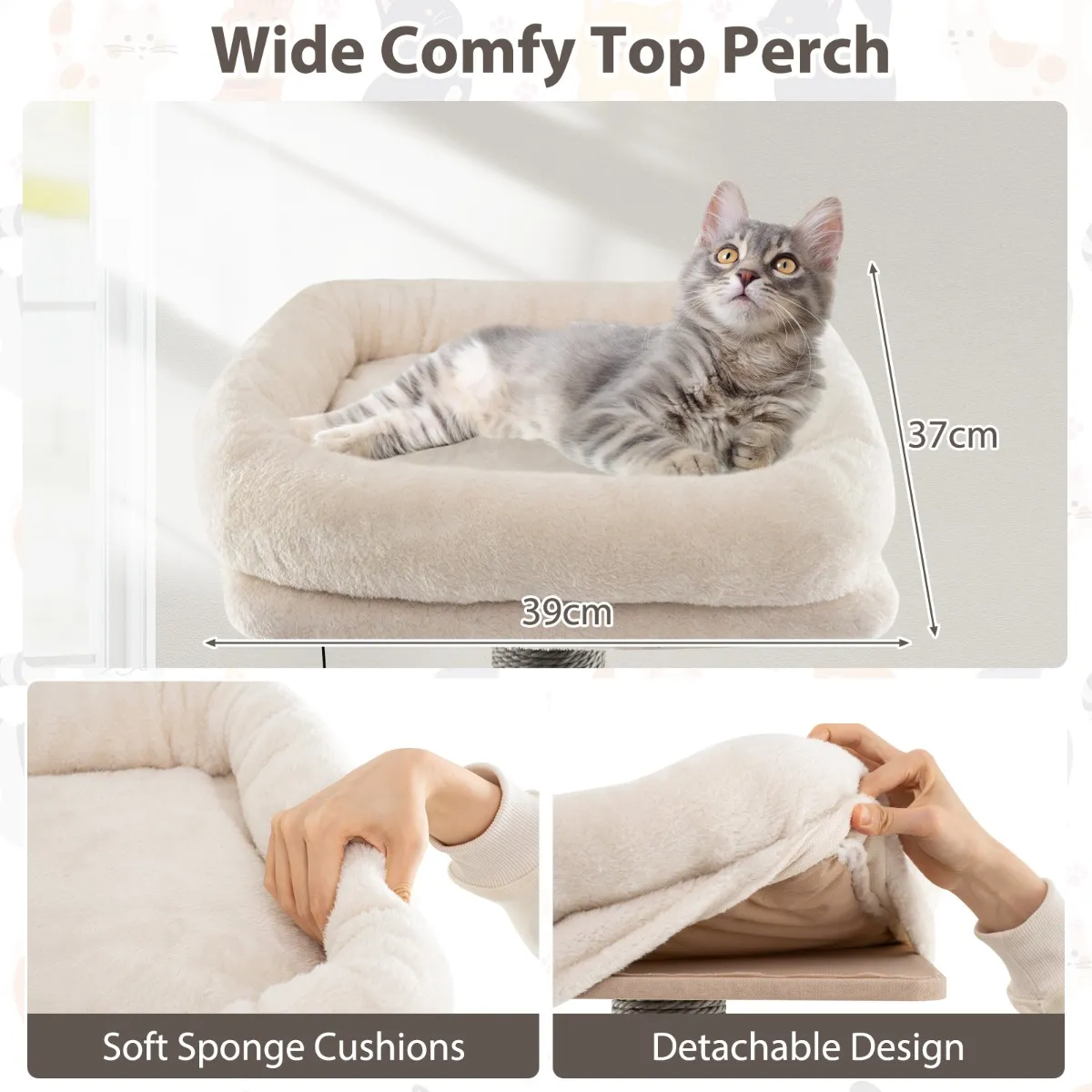 De grote condo biedt een knusse plek om te loungen en te schuilen, terwijl de brede zitstok met dikke badstof vulling een luxe plek biedt voor ontspanning en observatie. De afneembare kussens zijn ontworpen voor eenvoudig onderhoud en zijn ideaal om het hele jaar door te gebruiken. Het gladde oppervlak van de plank zorgt voor probleemloos schoonmaken. Met 6 klim- en ontdekniveaus maximaliseert deze ruimtebesparende krabpaal de verticale ruimte. Bovendien bevorderen de stevige krabpalen en de sisal krabplank een gezonde verzorging van de poten, en de speelse hangende pompon met bel bevredigt het natuurlijke instinct van je kat om te krabben, zich uit te rekken en te jagen.