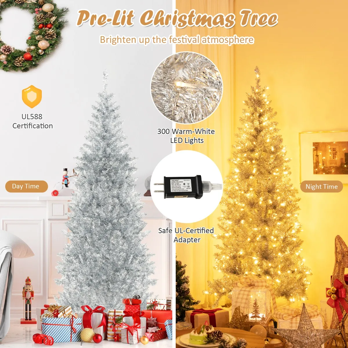 Onze voorverlichte kunstkerstboom van 180 cm heeft 790 weelderige takpunten bedekt met glanzende zilverfolie, waardoor een betoverende en realistische winterlook ontstaat. Bovendien kan de boom niet alleen overdag een sfeervolle decoratie zijn, maar ’s avonds ook je huis verlichten met zijn 300 heldere LED-lampjes, waardoor een gezellige en betoverende sfeer ontstaat. Onze boom is gemaakt van brandwerend PVC en wordt ondersteund door een stevige, gekruiste metalen voet. Het garandeert zowel veiligheid als duurzaamheid. Bovendien maken de scharnierende structuur en het driedelige ontwerp de installatie een fluitje van een cent, zodat u in een mum van tijd van de festiviteiten kunt genieten. En met zijn slanke en ruimtebesparende vorm is deze penvormige kerstboom ideaal voor kleine ruimtes of voor mensen die op zoek zijn naar een moderne en minimalistische kerstdisplay!