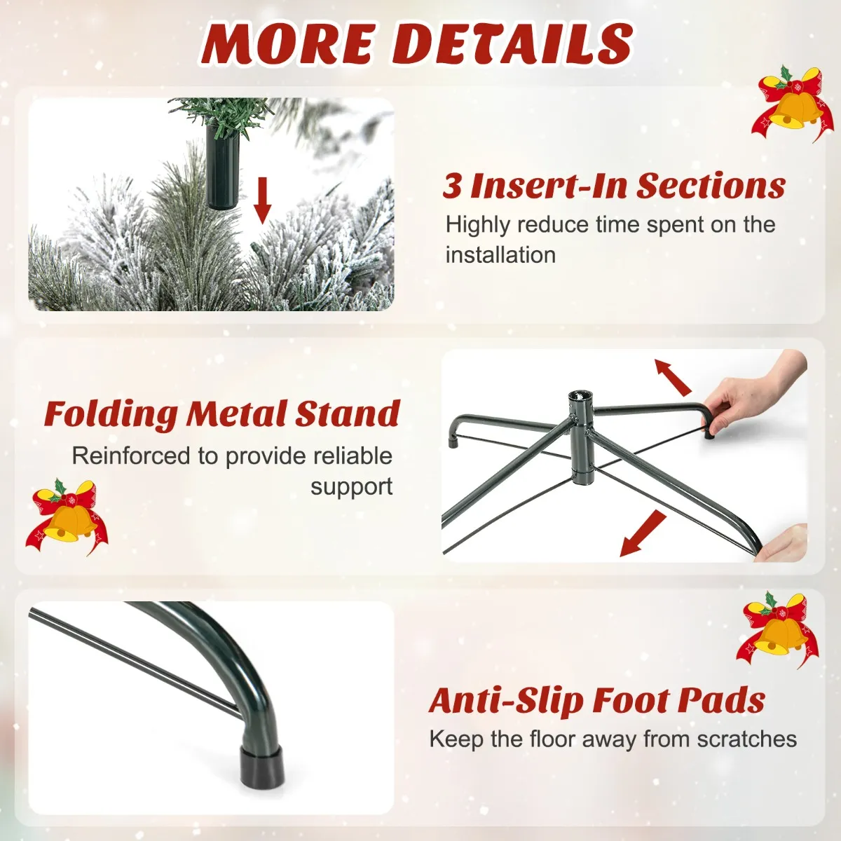 Stabiele, inklapbare metalen sokkel: Dankzij de stabiele metalen sokkel neigt de grote kerstboom minder om te kantelen. Met antislip pads aan de onderkant beschermt de kerstboom je vloeren tegen mogelijke krassen. En de metalen standaard is inklapbaar voor eenvoudige montage en opslag.