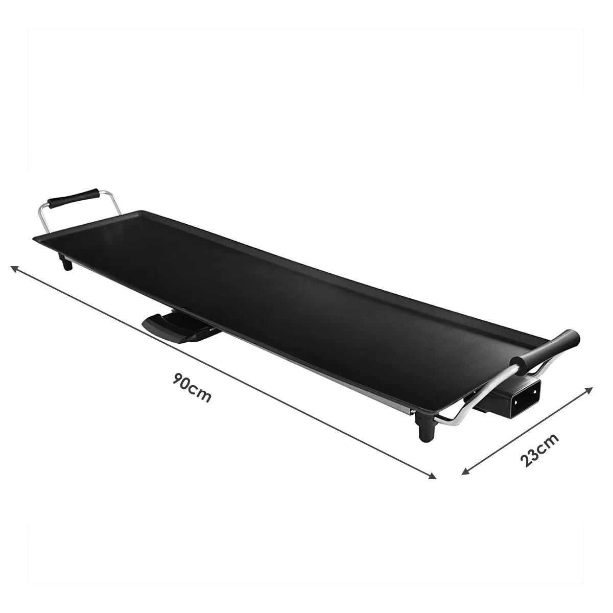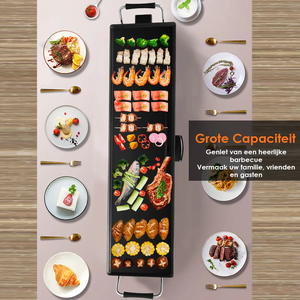 Heb je een goede helper nodig voor komende bijeenkomsten? De elektrische barbecue-grill met ultra grote plaat zal u nooit in de steek laten. Het meet 90 cm X 23 cm om een groot aantal voedingsmiddelen op te vangen. Op deze manier hoeft u zich geen zorgen te maken over te weinig ruimte om meer voedsel voor uw gasten te koken. Meer, 1800W grill bestaat uit een voedselveilig materiaal, wat zorgt voor een snellere en gezondere manier van koken. Bovendien zorgt het anti-aanbaklaagje voor een gezonde keuken zonder dat er te veel olie nodig is. De ingebouwde thermostaat met 5 standen stelt u in staat de temperatuur naar wens in te stellen. Bovendien zorgen een snellere warmtegeleiding en een gelijkmatige warmte voor een heerlijke barbecuesmaak. Andere kenmerken, zoals 2 eieren ringen, 6 houten spatels, metalen thermische schotten en een handig handvat, wachten op uw ontdekking.