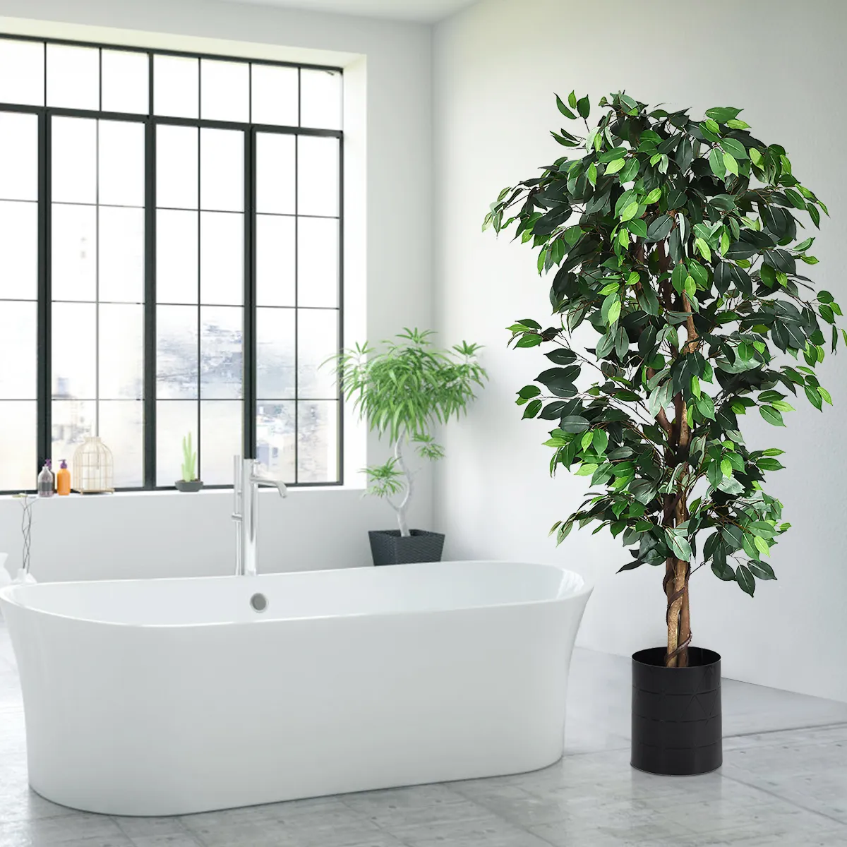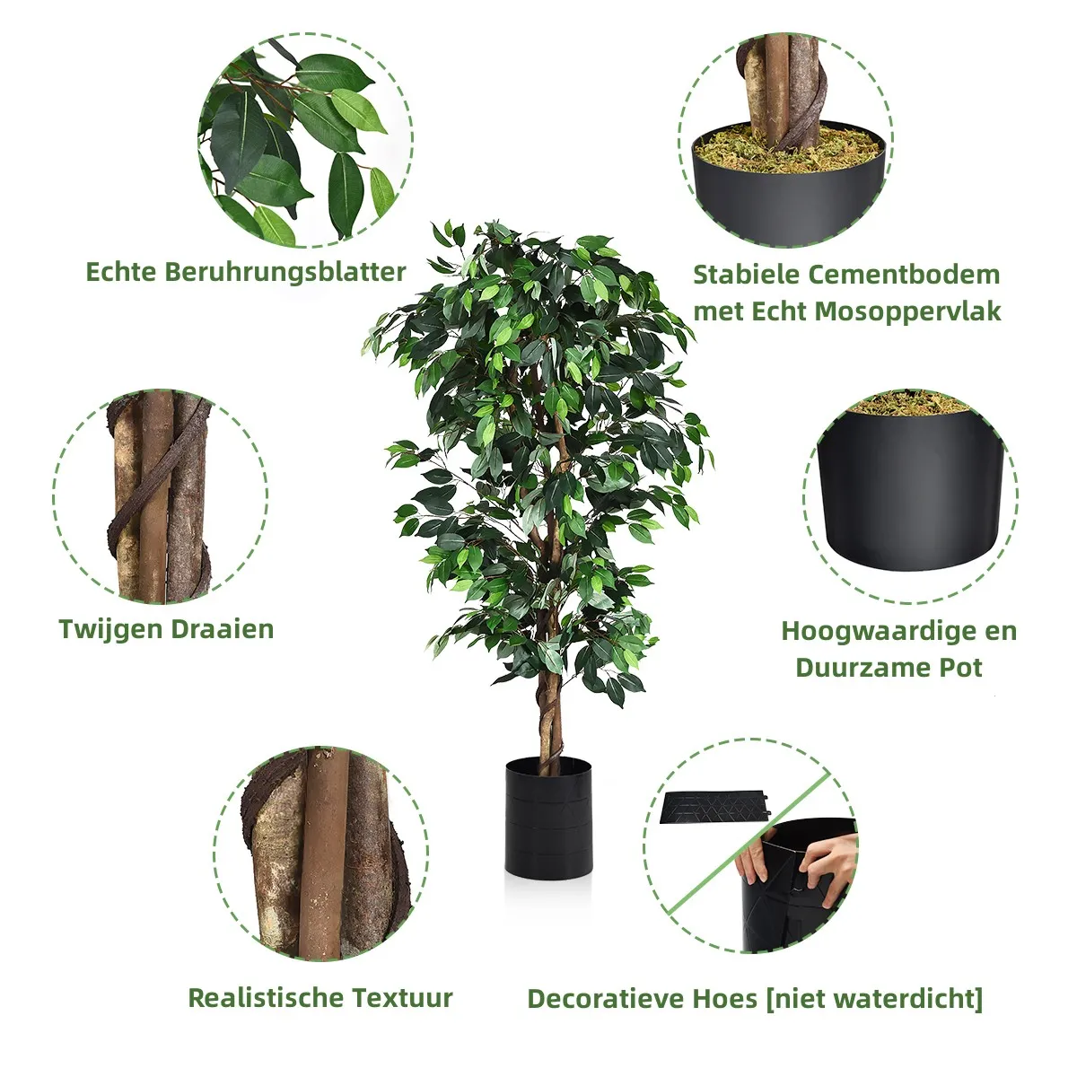 De 1008 bladeren hebben niet alleen een duidelijke textuur, maar zien er ook net zo weelderig uit als die van een echte boom. De hardhouten stam en de cementen voet zorgen voor grote stabiliteit en houden hem stevig op de grond. Met decoratief mos op de pot en realistisch gedraaid rotan, geeft hij u altijd een fris natuurgevoel en past hij perfect in verschillende interieurstijlen. Deze ficus zou gewoonweg charmant staan in ramen van vloer tot plafond, maar ook bij de ingang van een huis of zelfs op kantoor.
