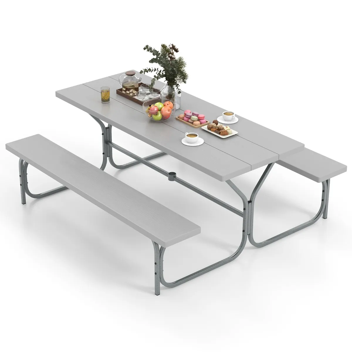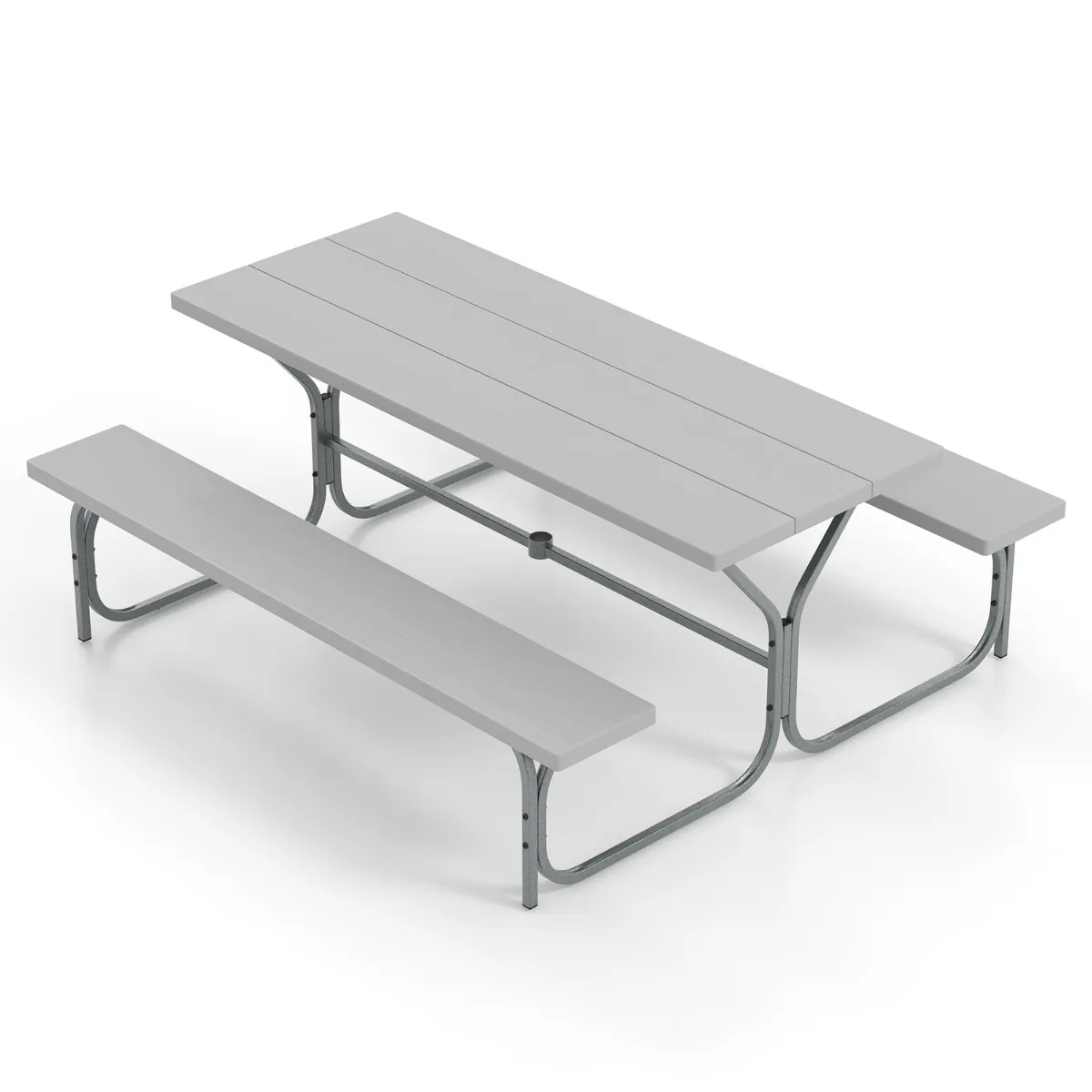 【Geïntegreerd parasolgat】 Deze picknicktafel is ontworpen met een geïntegreerd parasolgat met een diameter van 47 mm, waardoor je schaduw en bescherming tegen de zon kunt bieden. Bovendien heeft de tafel een bevestigingsgat aan de onderkant om je parasol verder vast te zetten.