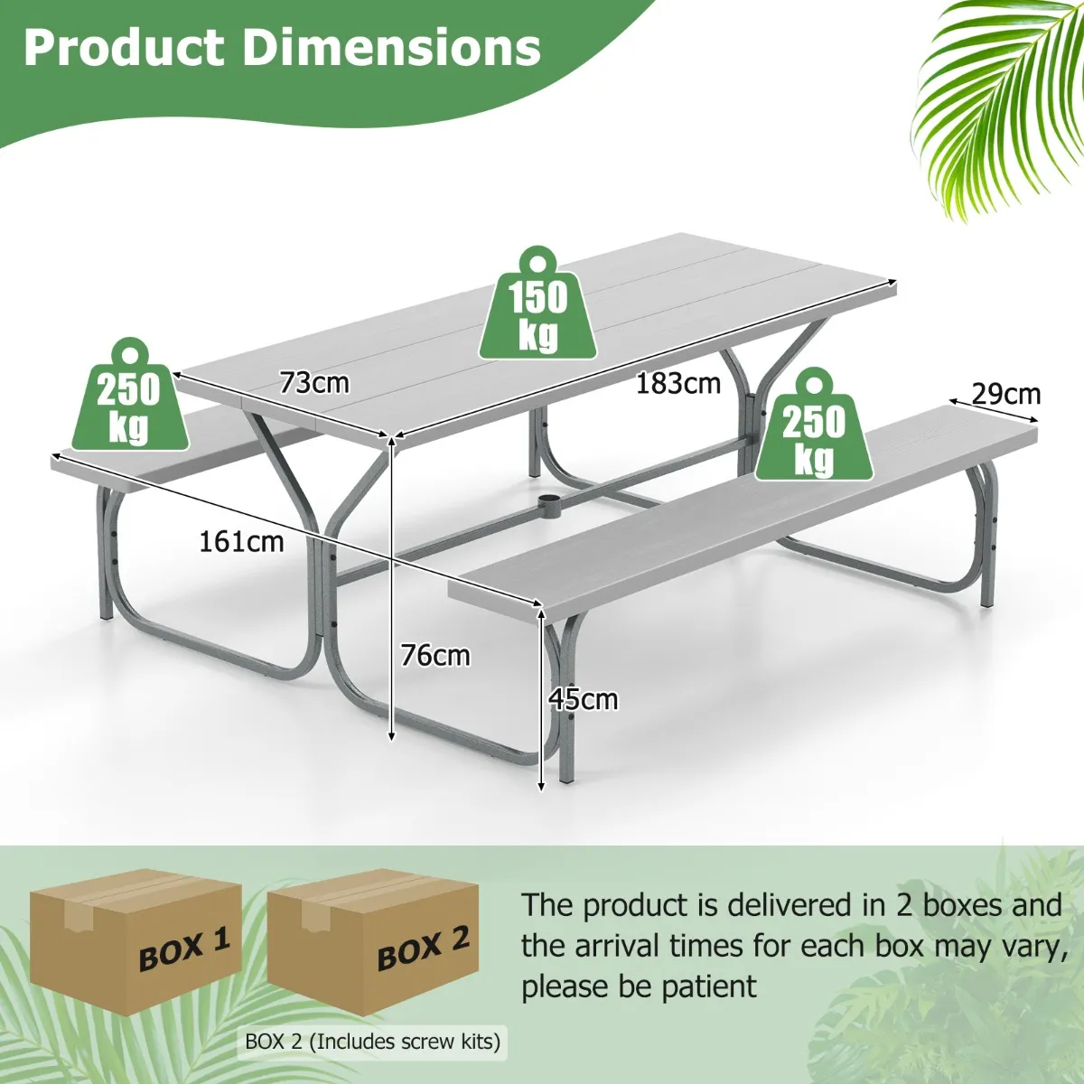 Onze set bestaat uit een rechthoekige tafel en 2 banken die een comfortabele plek bieden om met het gezin buiten te eten. Het HDPE tafelblad is weer-, scheur- en UV-bestendig. Het stevige gepoedercoate metalen frame zorgt voor stevigheid en stabiliteit. De tafel is ontworpen met een geïntegreerd parasolgat, zodat je gemakkelijk je parasol kunt plaatsen. Met zijn delicate houtachtige textuur en strakke lijnen kan hij worden gebruikt in woonkamers, balkons, patio’s en terrassen.