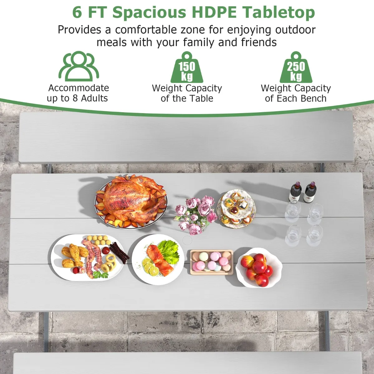 Ruim 183 cm HDPE tafelblad biedt voldoende ruimte voor eten, drinken en andere benodigdheden