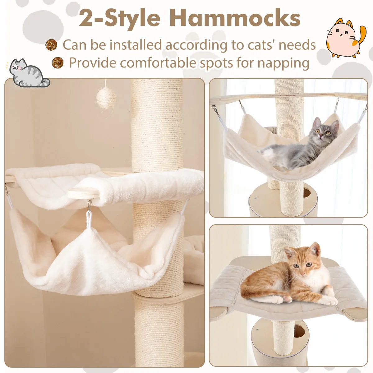 【Meerdere rustplaatsen】 Naast de condo biedt de kattentoren 2 stijlen hangmatten die afzonderlijk of tegelijkertijd kunnen worden gebruikt om je katten in luxe comfort te laten ontspannen. Daarnaast zijn er 2 zitstokken waarop katten hun omgeving kunnen observeren en zich koesteren in het warme zonlicht.