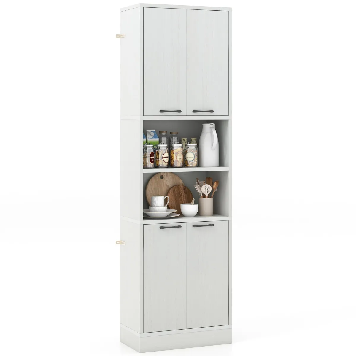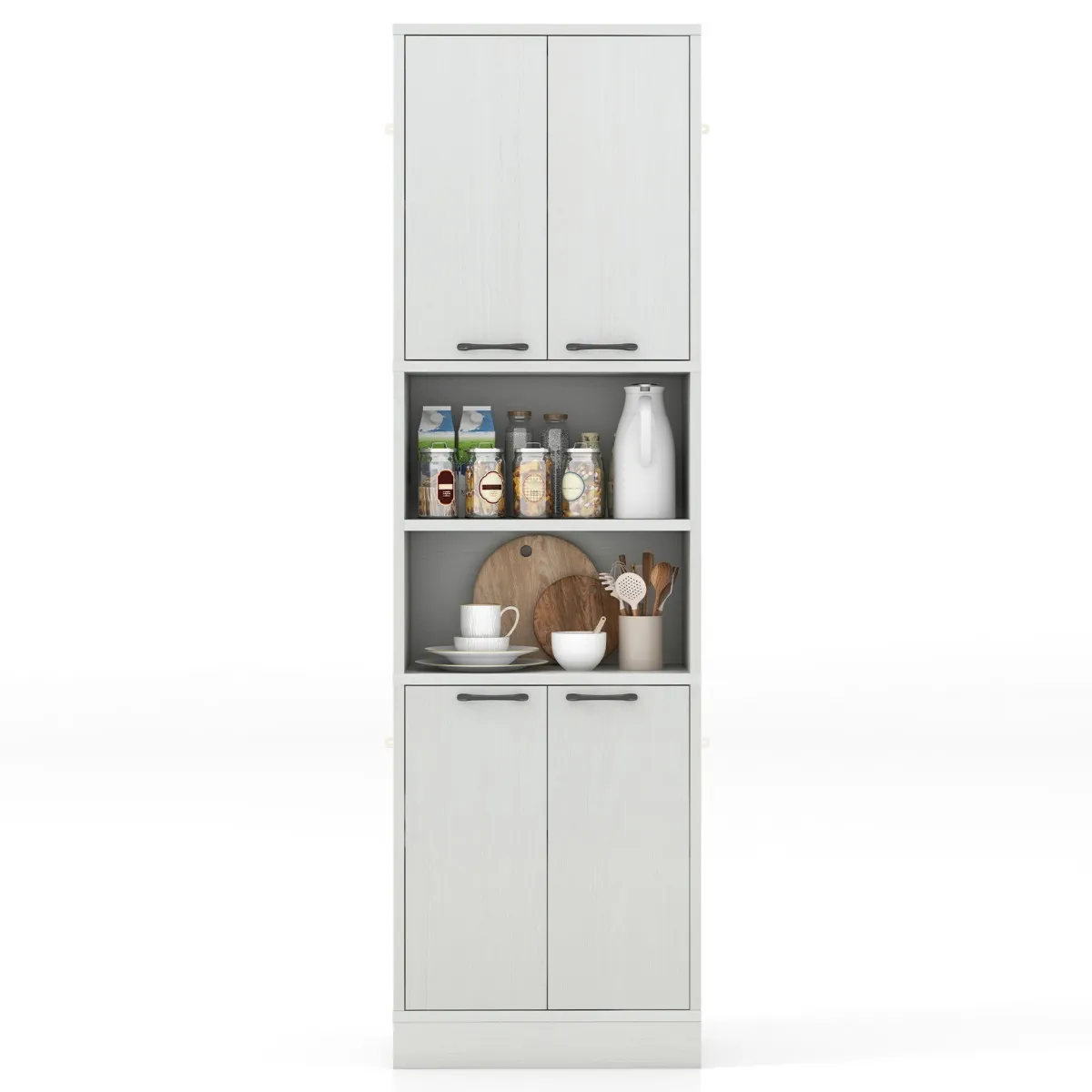 Dit keukendressoir heeft 2 dubbele deurkasten met planken en 2 open planken om aan je behoeften te voldoen. De 4 deuren helpen voorkomen dat spullen vallen en houden ze stofvrij. Er zijn gemakkelijk te hanteren handgrepen en metalen scharnieren voor moeiteloos openen en sluiten. Een stevige basis, een anti-tipsysteem en antislip-pads zorgen ervoor dat hij stabiel genoeg is. Hij dient niet alleen als dressoir, maar doet het ook goed als kast, koffiebar, vitrinekast of badkamerkastje.