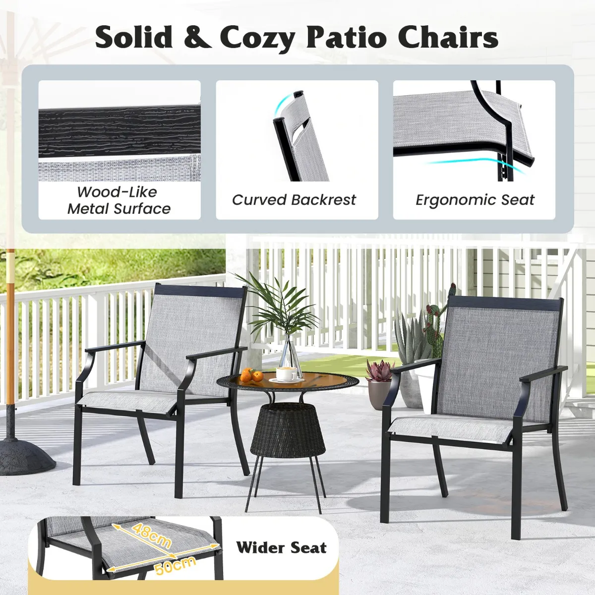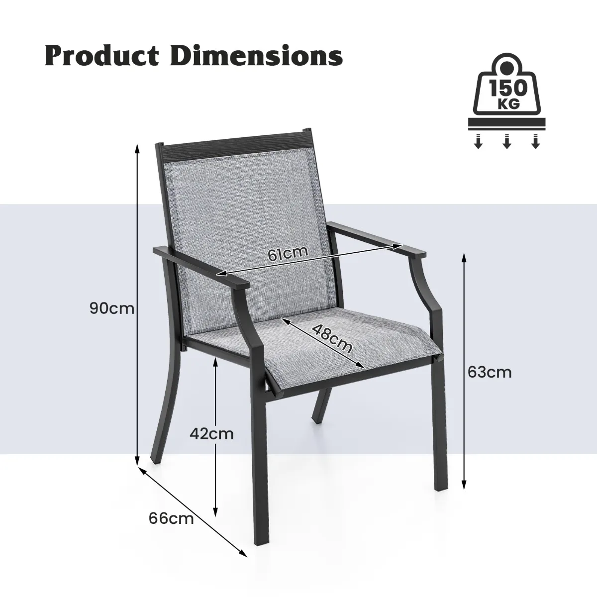 Deze 2 stoelen zijn ontworpen met een 50 cm brede zitting en bieden ongeëvenaard comfort. De gebogen rugleuning en ergonomische zitting verlichten vermoeidheid en zorgen voor een comfortabelere zitervaring. De zitting en rugleuning zijn gemaakt van scheurbestendige, kleurvaste stof en zijn ontworpen om langdurig buiten te worden gebruikt. Ondersteund door een robuust metalen frame zijn ze roestbestendig, bestand tegen kromtrekken en zeer sterk. Door hun mooie uiterlijk zijn ze perfect voor verschillende buitenruimtes, zoals de tuin of het terras.