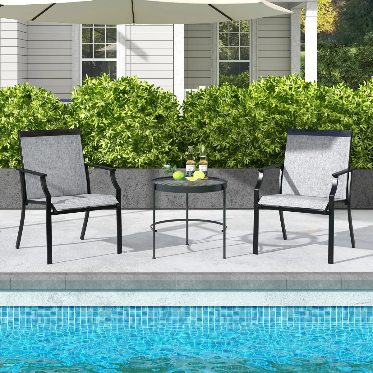 【Geweldige aanvulling op het terras】 Het houtachtige metalen oppervlak op de rugleuning van de stoelen voegt een vleugje elegantie toe aan de omgeving. Deze stevige, comfortabele terrasstoelen zijn perfect voor vele buitenruimtes, zoals de binnenplaats, het zwembad of de tuin.