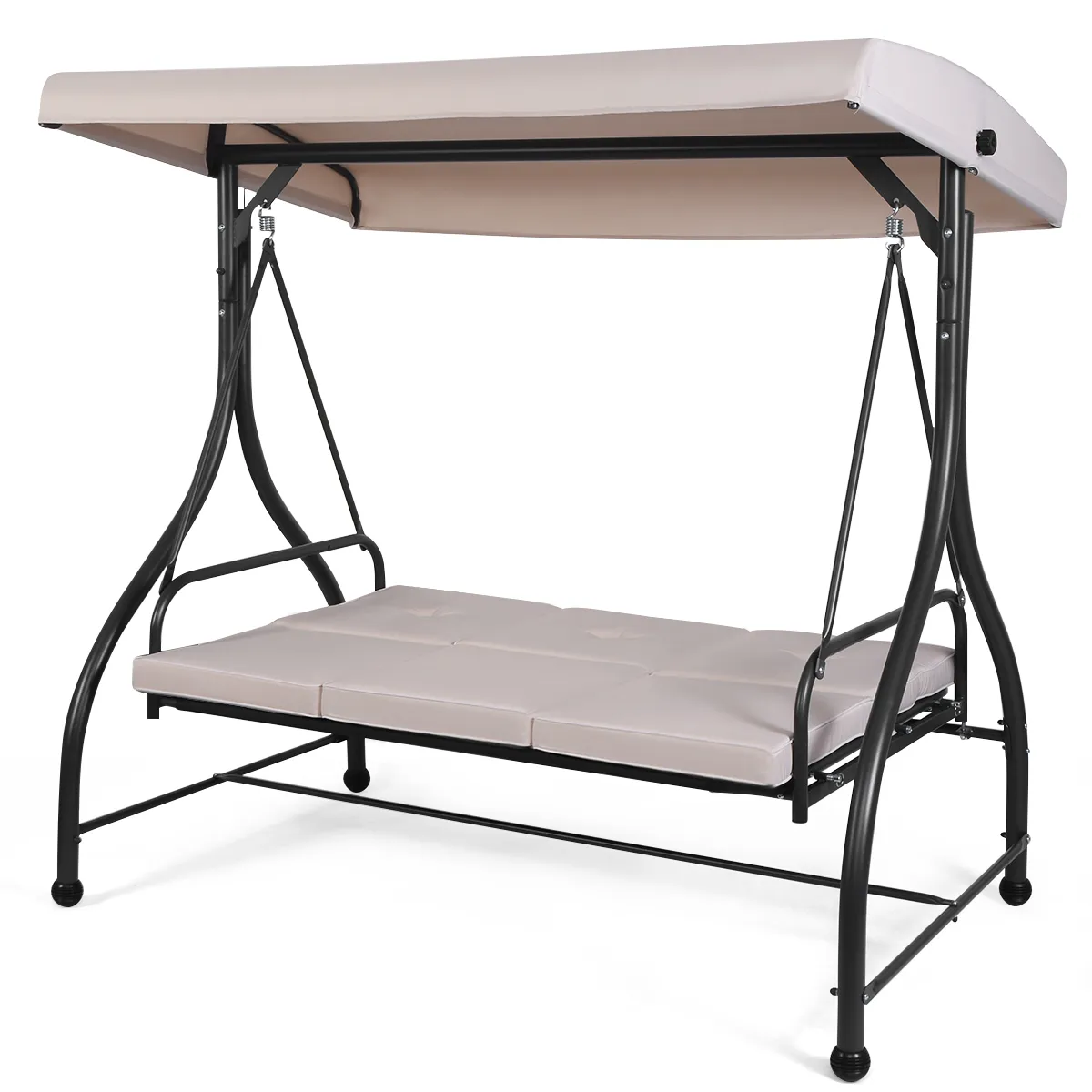 Stijlvol ontwerp voor verschillende gelegenheden: Het elegante metalen frame en de gebogen armleuningen, de effen en ingetogen kleur zijn allemaal ontworpen met een unieke stijl. Het sierlijke uiterlijk voegt een modern tintje toe, perfect voor veranda, terras, tuin en andere plaatsen. Geniet met vrienden en familie terwijl je lounget op deze 3-persoonsschommel.