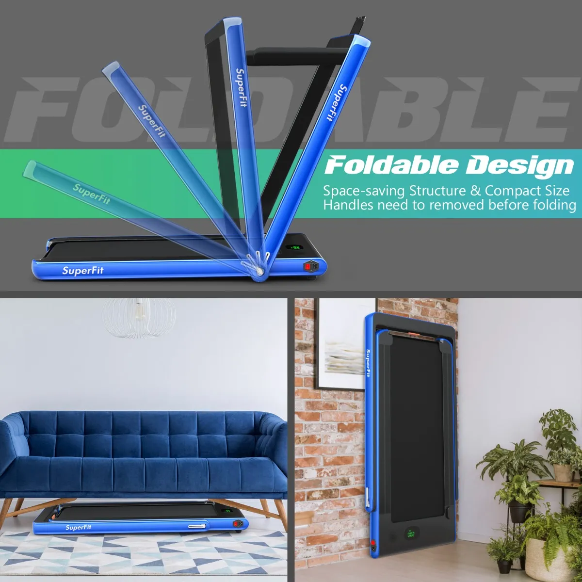 Multifunctionele 2-in-1 loopband –Â De opvouwbare 2-in-1 loopband heeft 2 selecteerbare standen. Wanneer de leuningen zijn ingeklapt, kan deze worden gebruikt met een snelheid van 1-4 km/u, wat een meer ontspannen rijtijd biedt. Wanneer de leuningen zijn opgeklapt, is de loopsnelheid 1-12 km/u, ideaal voor training en fitness.